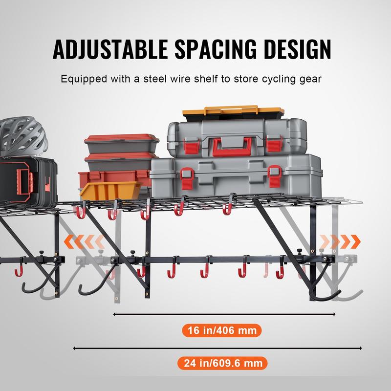 ·Adjustable Spacing: The bike wall rack adopts an adjustable spacing design, allowing the triangular support brackets to move laterally. This design lets you adjust the spacing between brackets to fit different bicycle types. Plus, the rack is equipped with shelves for storing helmets, pumps, repair kits, etc.