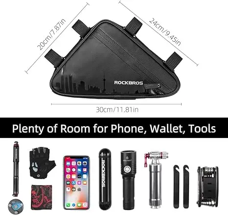 With a large pocket both on the left and right side, ROCKBROS bike triangle bag has the convenient advantage of plenty of room for wallet, phone, gloves, and tools for what you want to storage