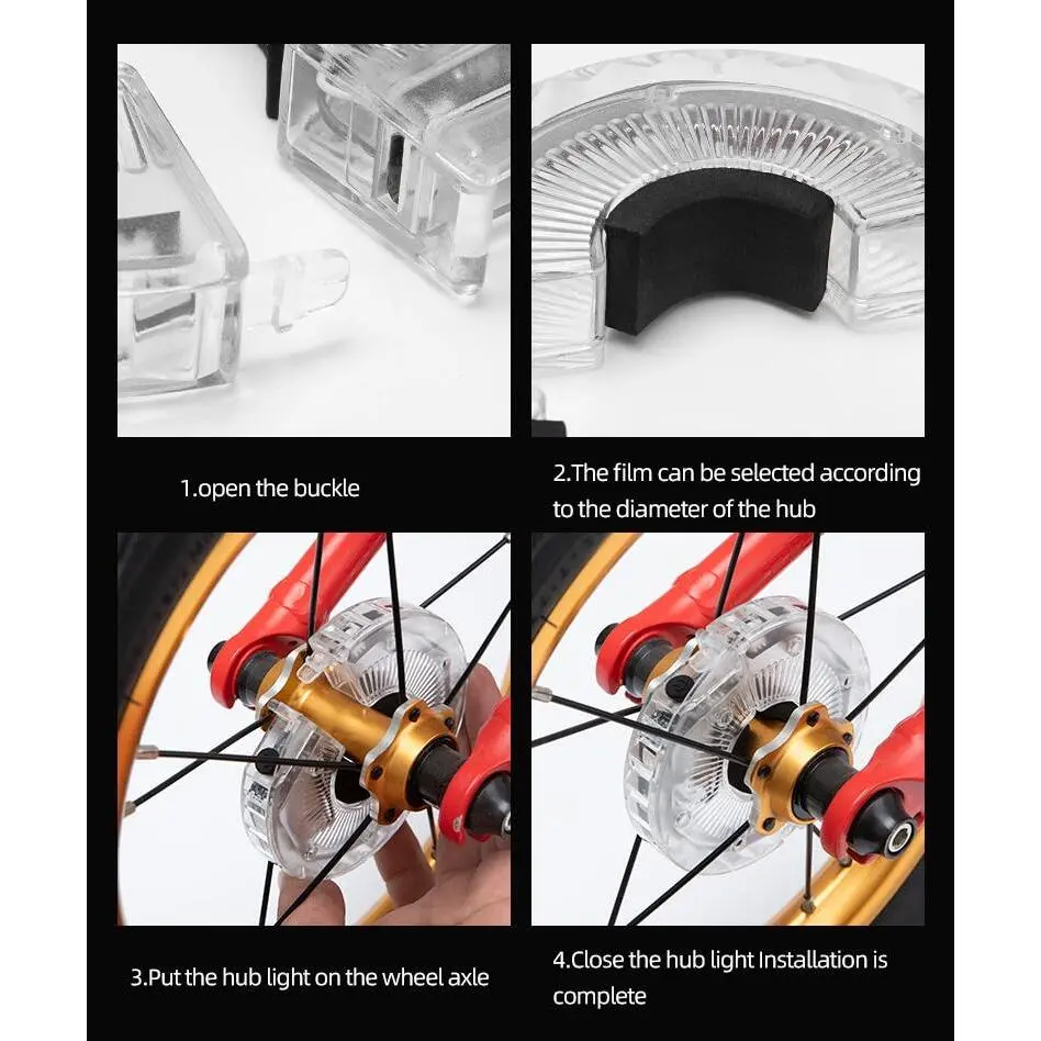 ·EASY TO INSTALL: Super simple to install,just select appropriate sized hub pad (6 pieces included) to stick on the inner ring of the light and no tools required. Make sure you check and measure your hub diameter as our bike tire lights fits diameter within 30mm/1.18in. (Fit for hub diameter≤30mm/1.18in ).