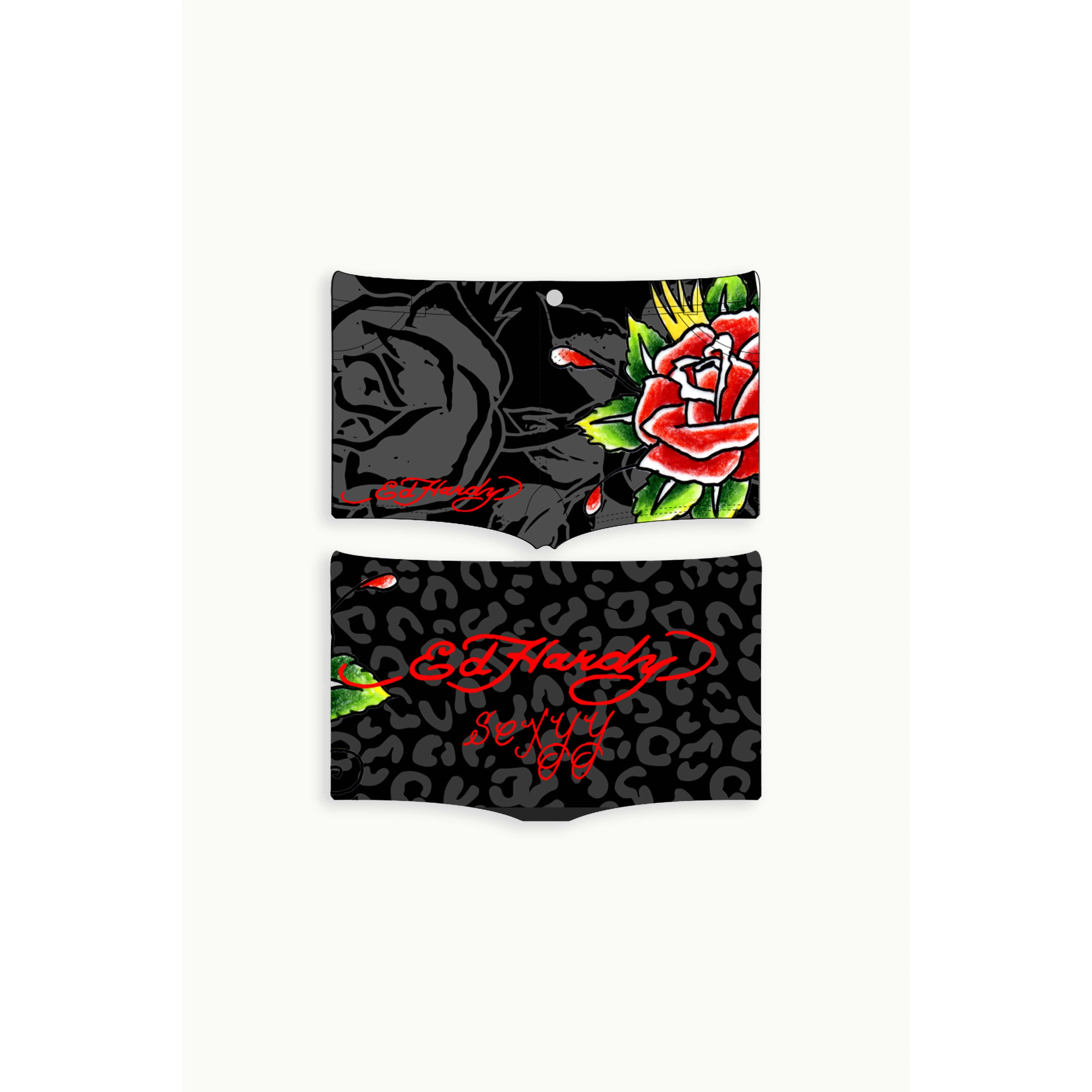 Black leopard pattern printed on back panel with "Ed Hardy Sexyy" logo.