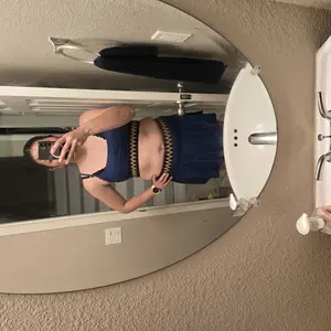 Material is more on the thinner side. Also not as high waisted as it says it is, sits right under the belly button. It’s cute but size is a little off