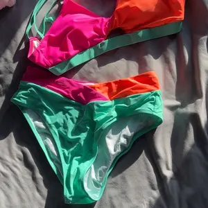 Introducing the Color Block Front Cutout Back Lace-up Bikini Set – a captivating and stylish choice for your sunlit adventures. With an alluring cut-out detail and flattering V-waist bottoms, this set is designed to elevate your beachwear.