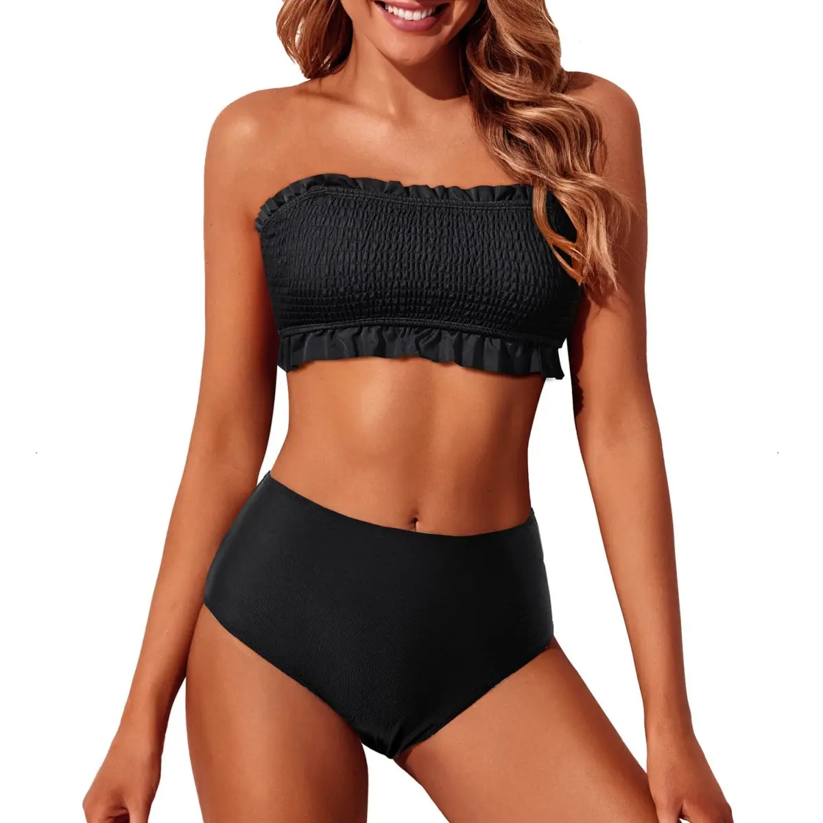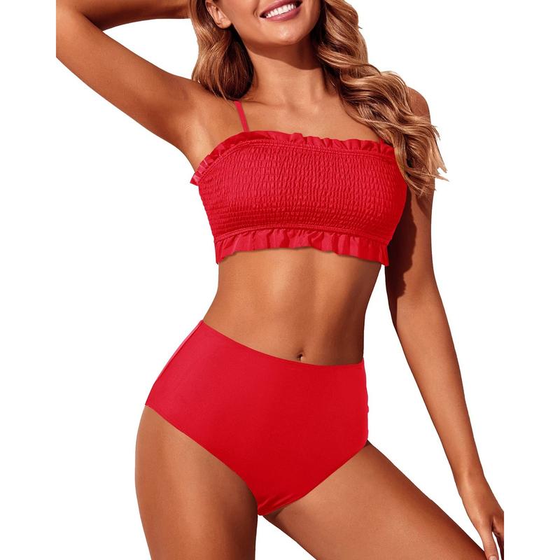 Two Piece High Waisted Bikini Bandeau Smocked Swimsuit