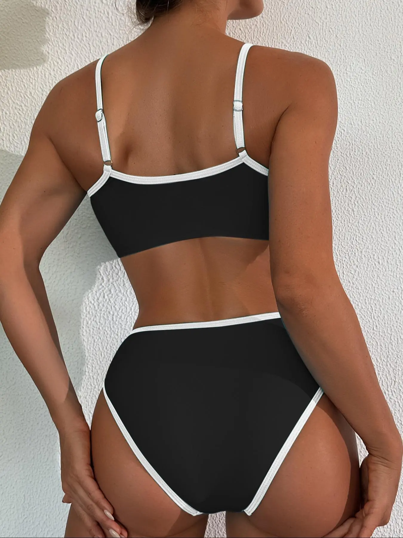 Two-piece Set Women's Solid Color Bikini Set, Casual Adjustable Strap Swim Top & High Cut Swim Bottom, Two-piece Swimsuit for Beach Holiday Vacation, High Waist Swimsuit, High Waisted Swimsuit