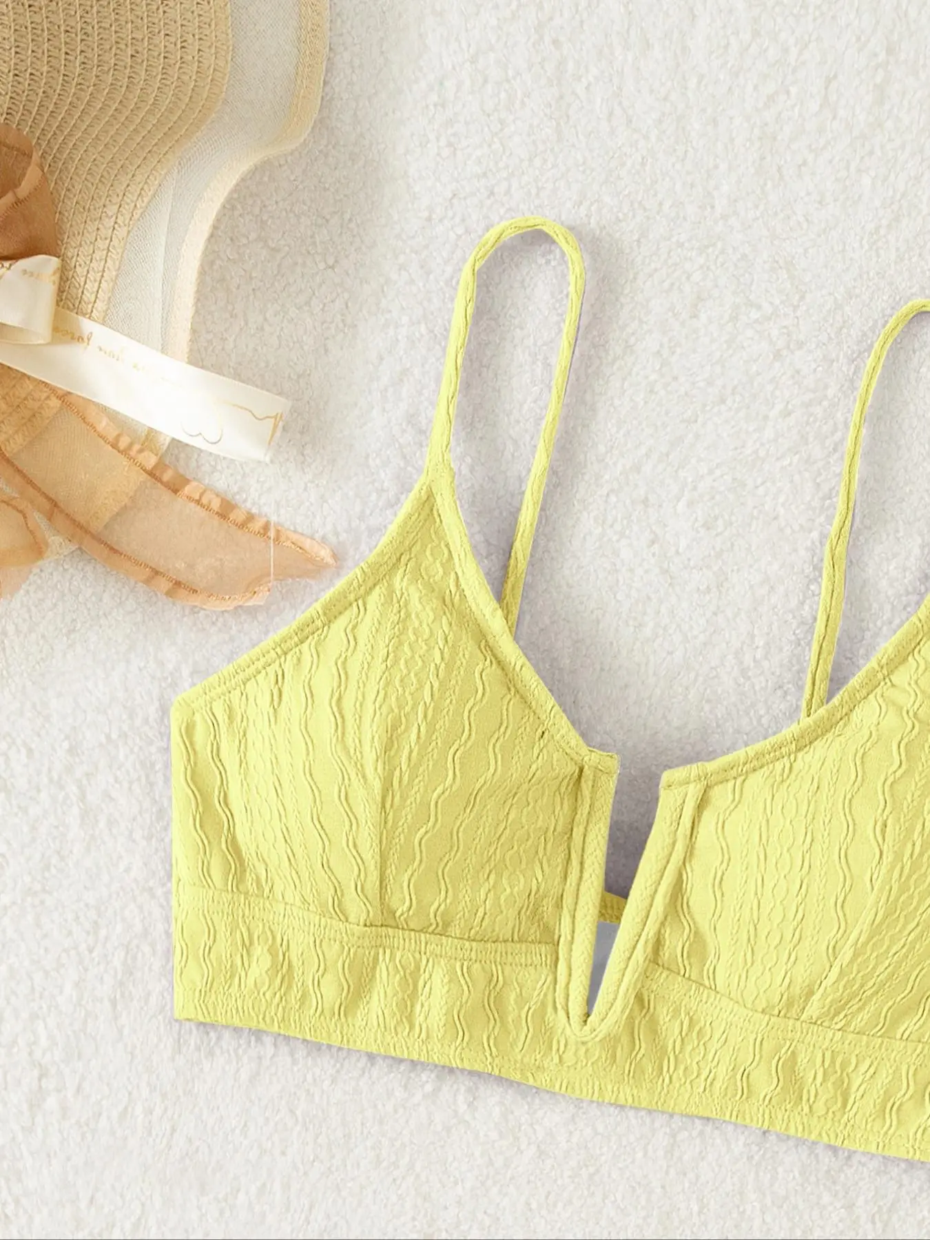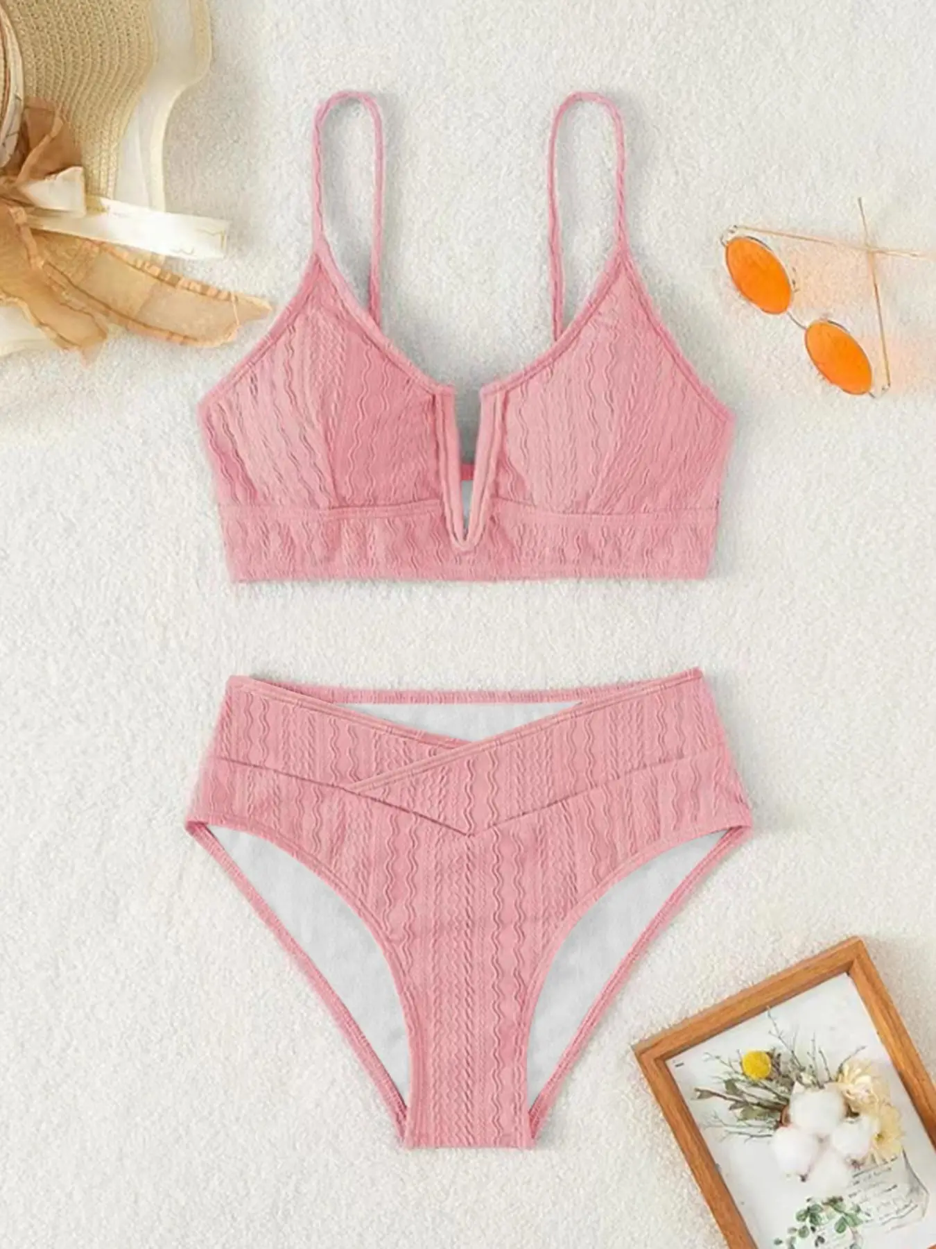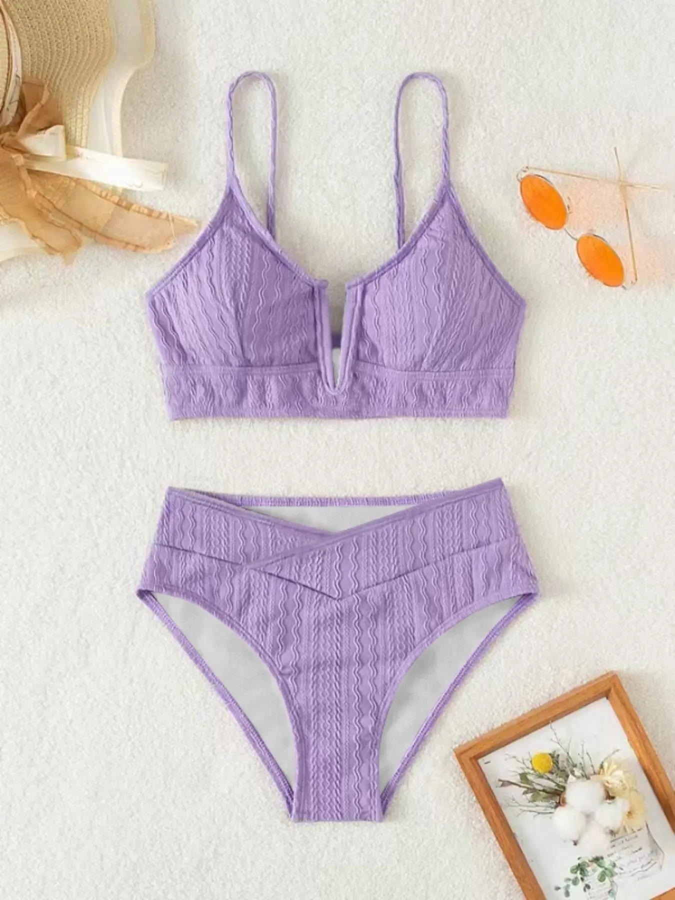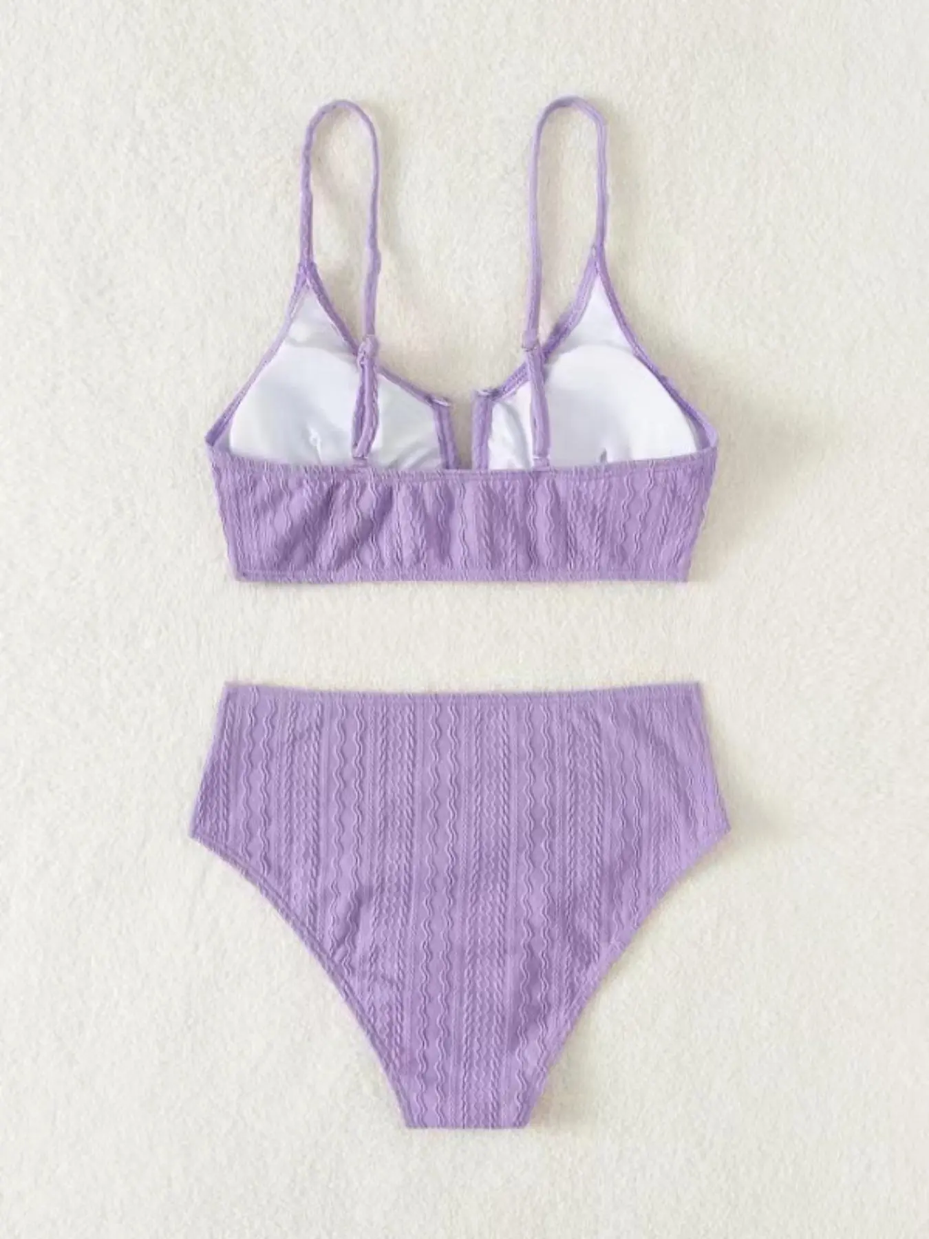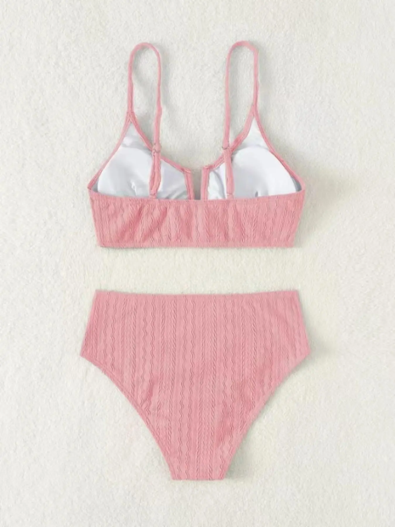Absolutely love the color and texture on the material of the swimsuit. Also, the design is very flattering, especially with the V shape on the front.