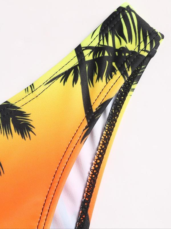 5. Women's Vacation Palm Tree Printed Halter Bikini Set With Tie Strings And Matching Bikini Set Cover-Up Skirt, Random Print, 4pcs/Set Summer Beach