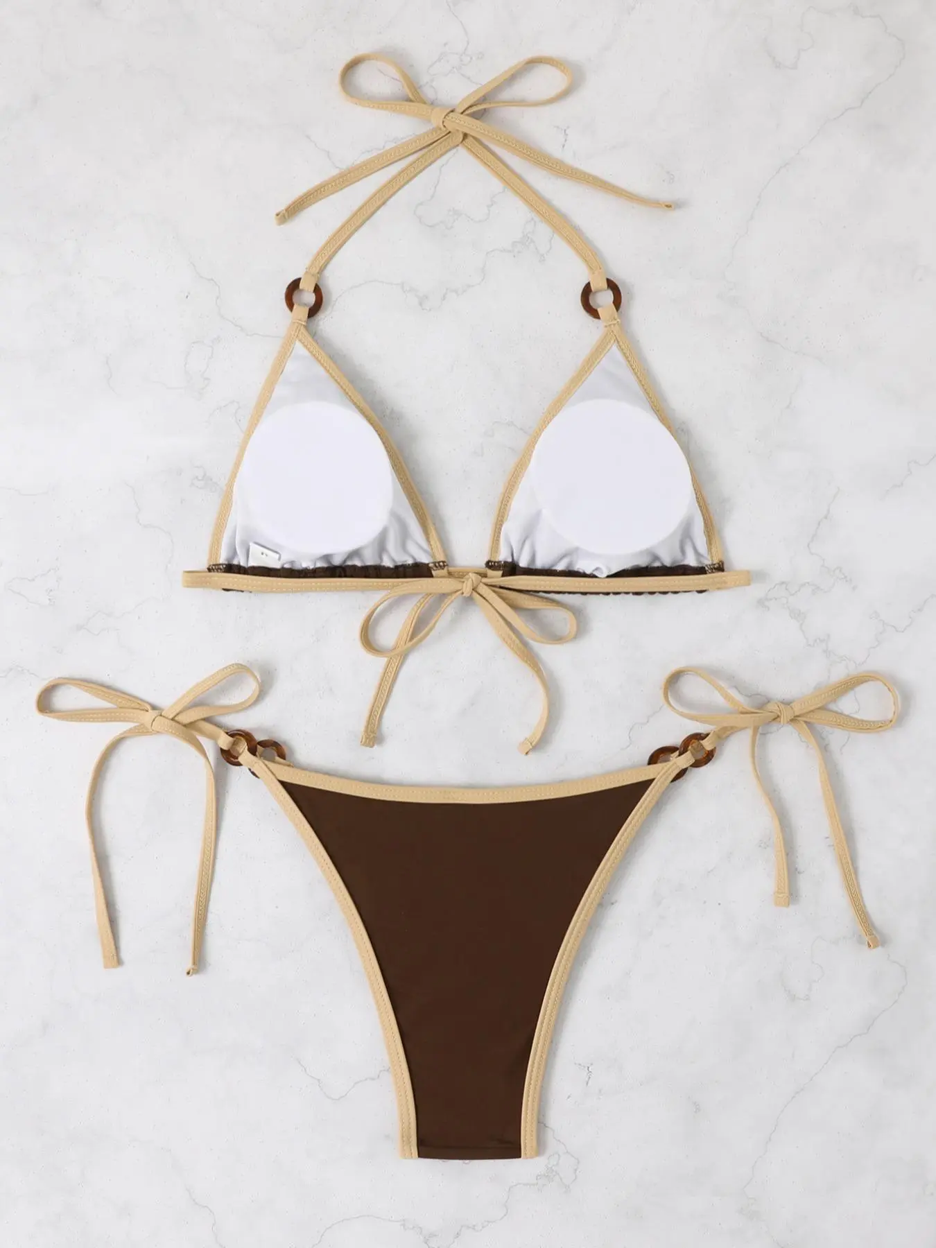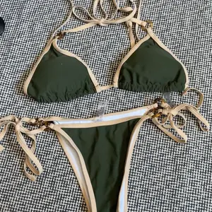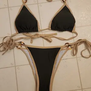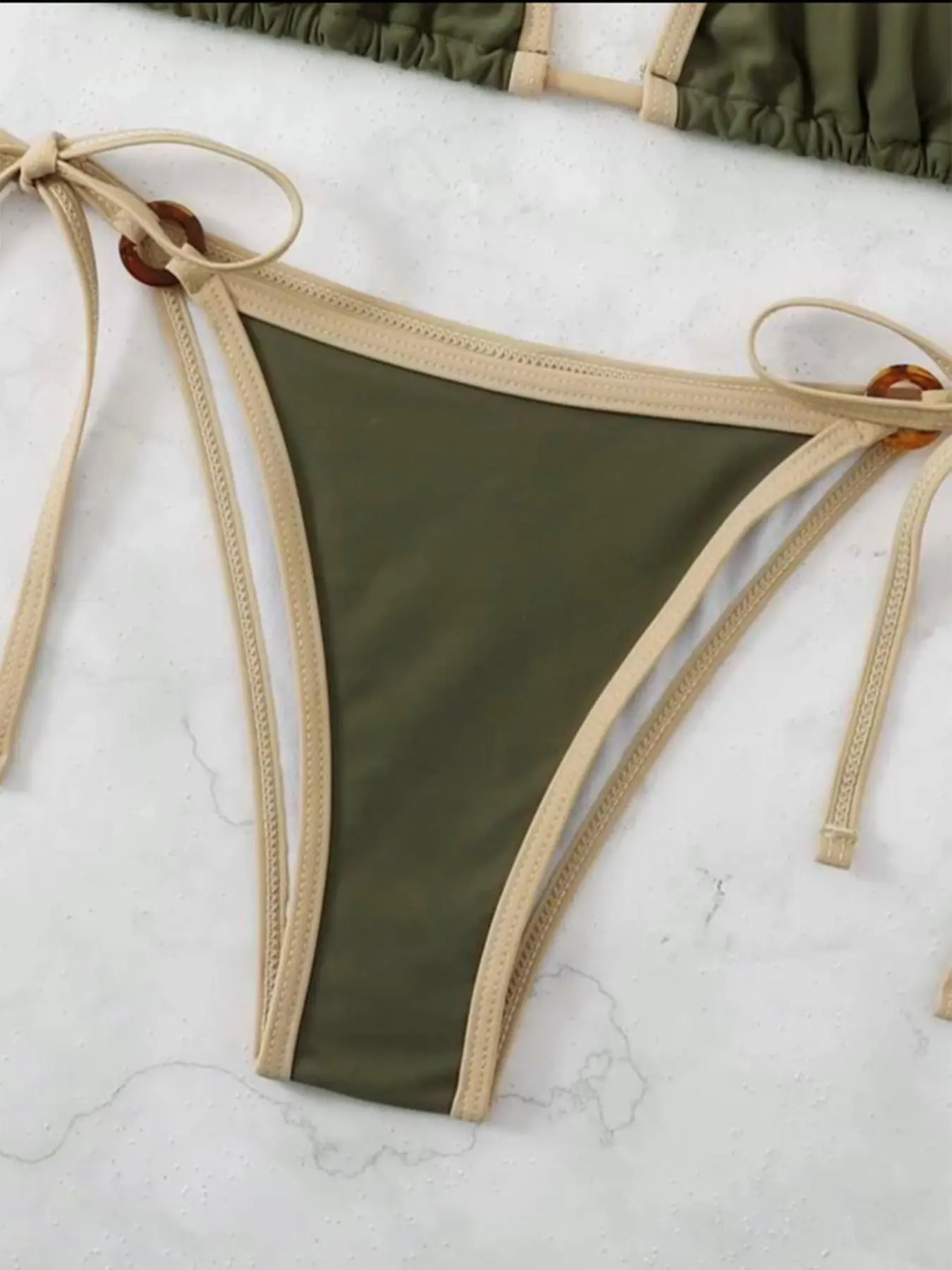 Love this Bikini! The trim and brown accents give it such a unique look. I am wearing an XL and the bottoms were able to cover my caesarean scar. The top held up great. And the color is very complementary.