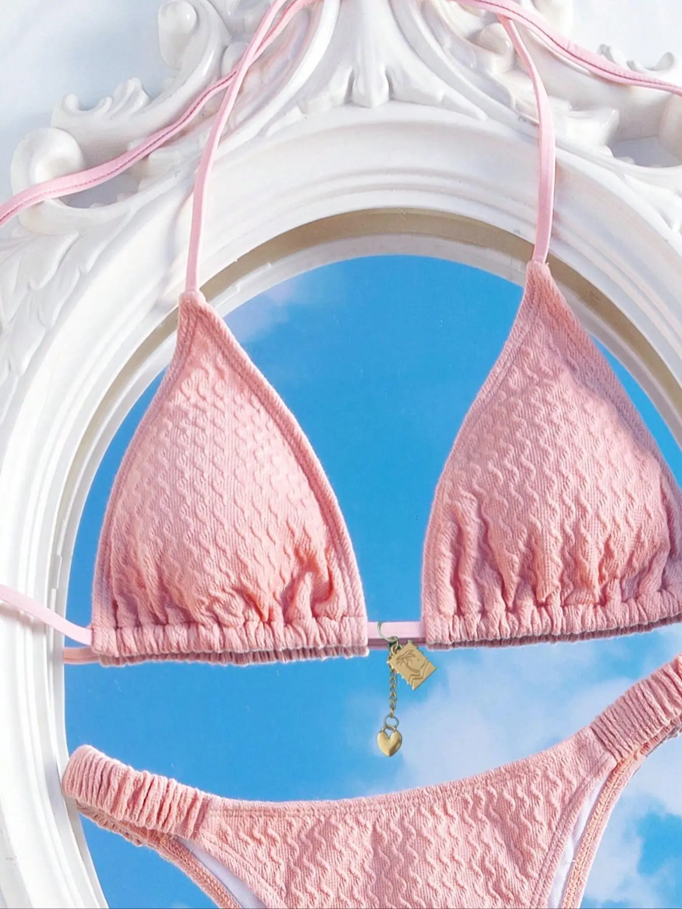 Bikini is super cute! Both the bottoms and the top have a fabric soft like texture, and doesn’t feel cheap at all.