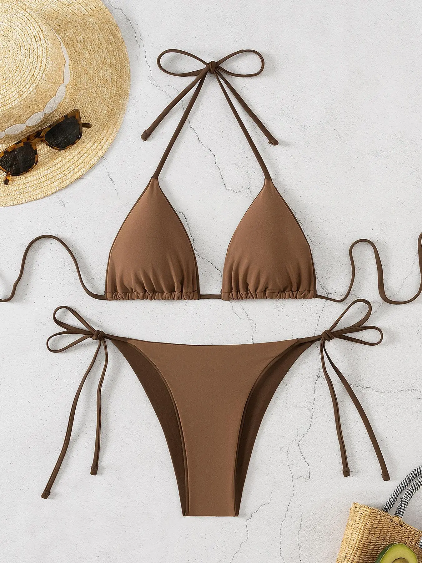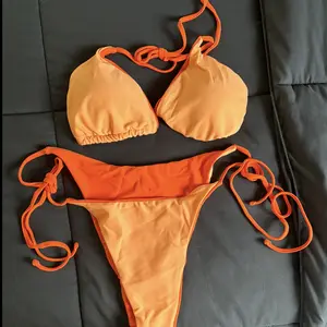 Top is so so cute, but the triangles are short and wide more than tall and narrow. Bottoms fit kinda weird, they’re lower cut than expected and they are too wide in the back to feel more like a cheeky/thong but too narrow to sit flat so they kinda give you diaper butt.