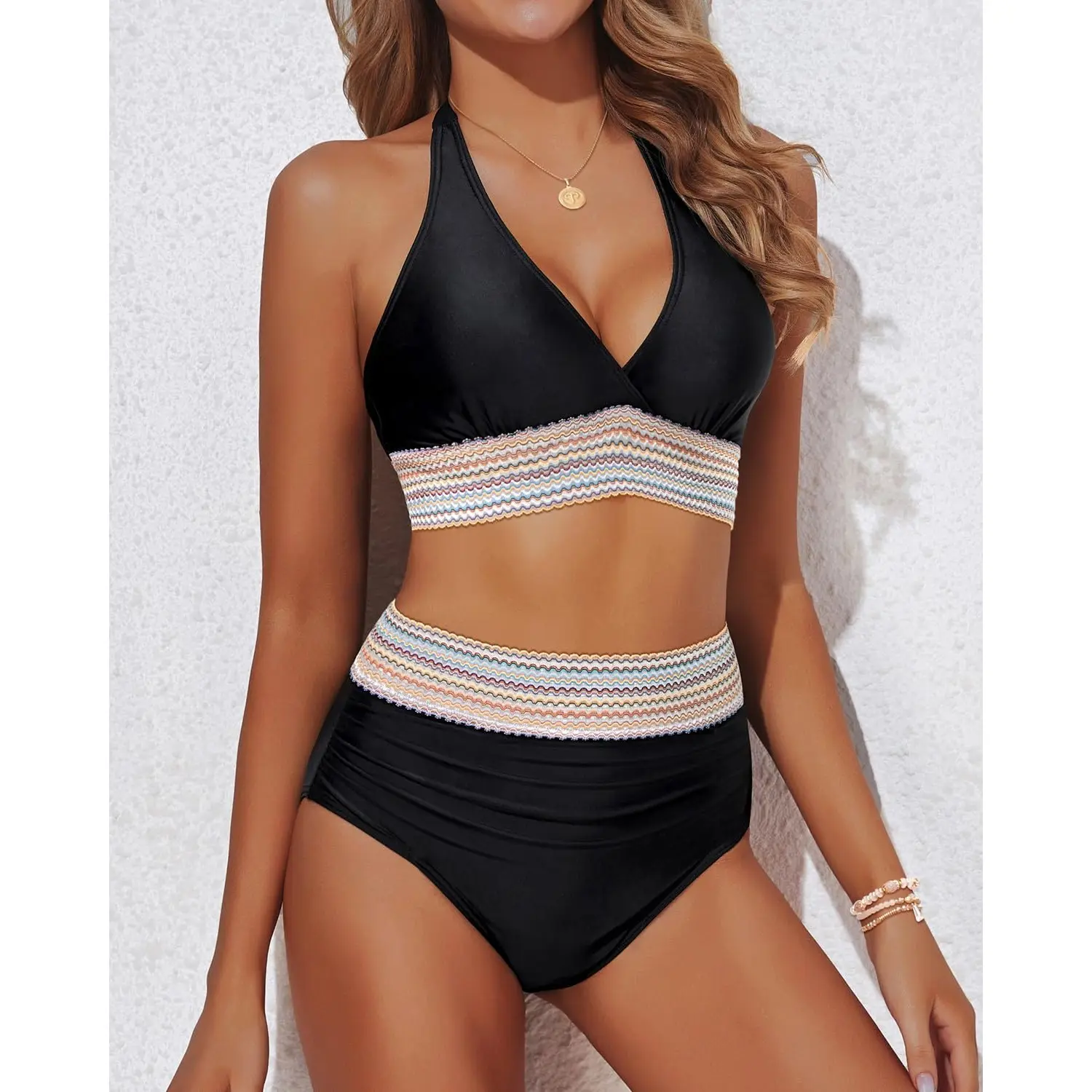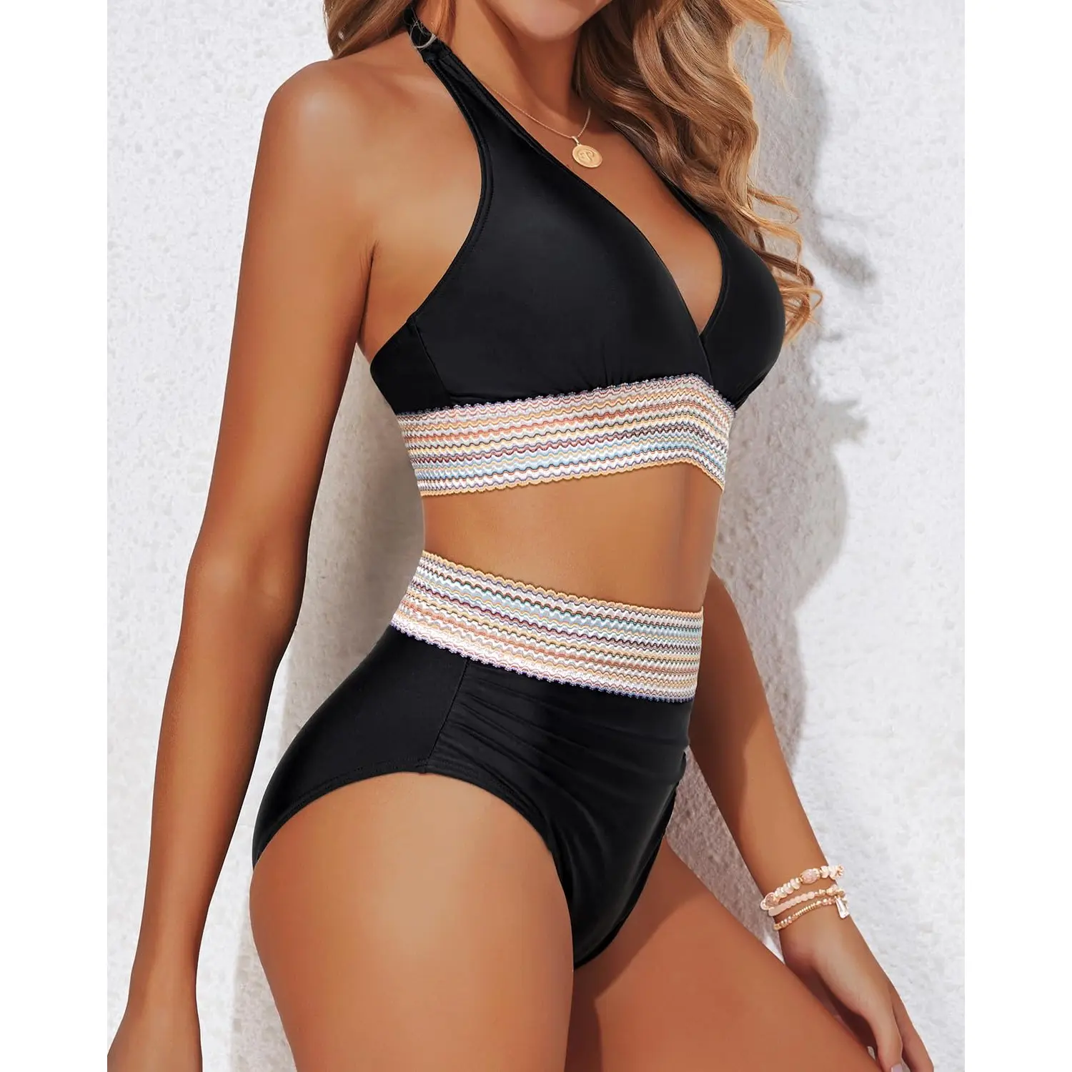 Yonique Women High Waisted Tummy Control Bikini Swimsuit Halter Bikini Top Push Up Color Block Two Piece Bathing Suit