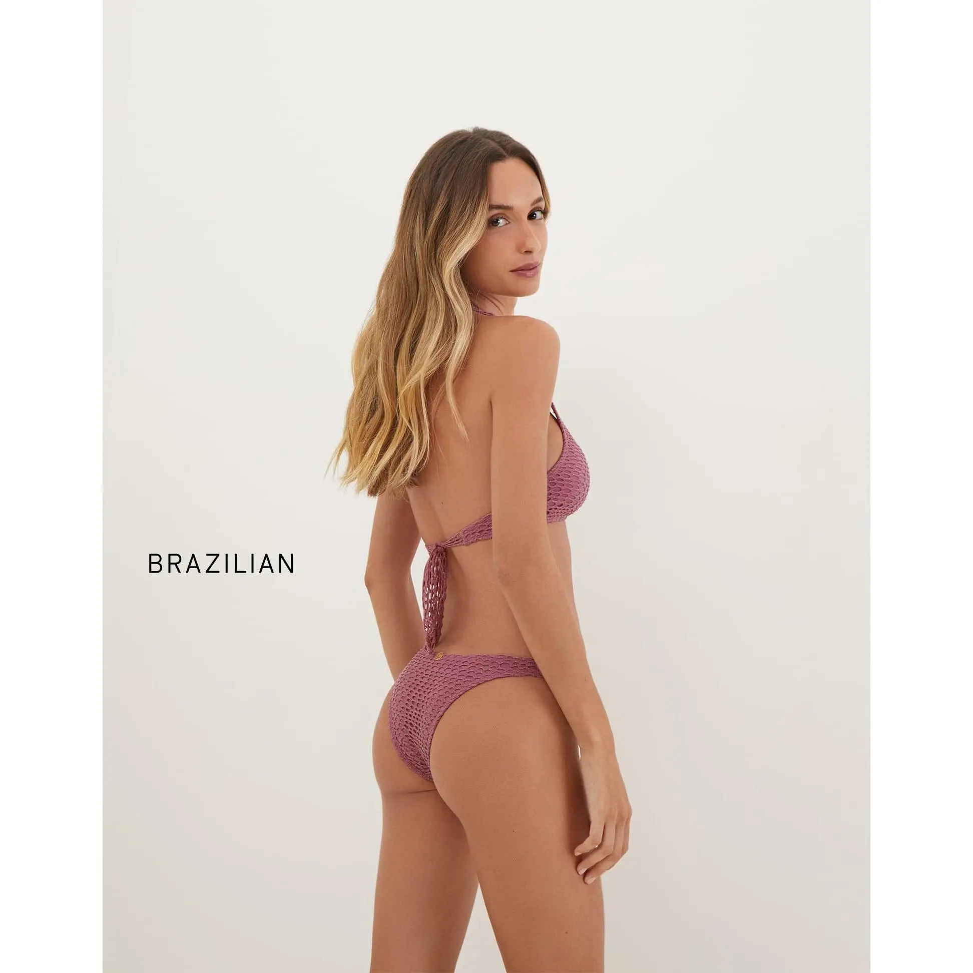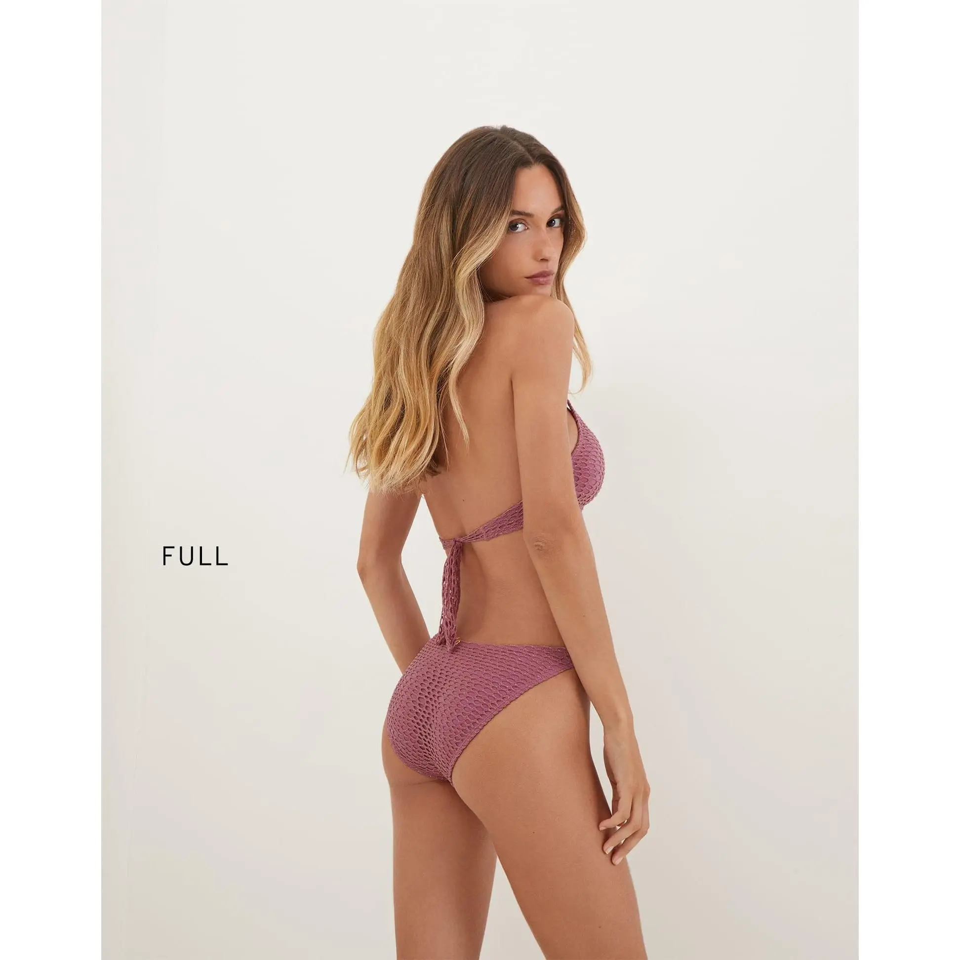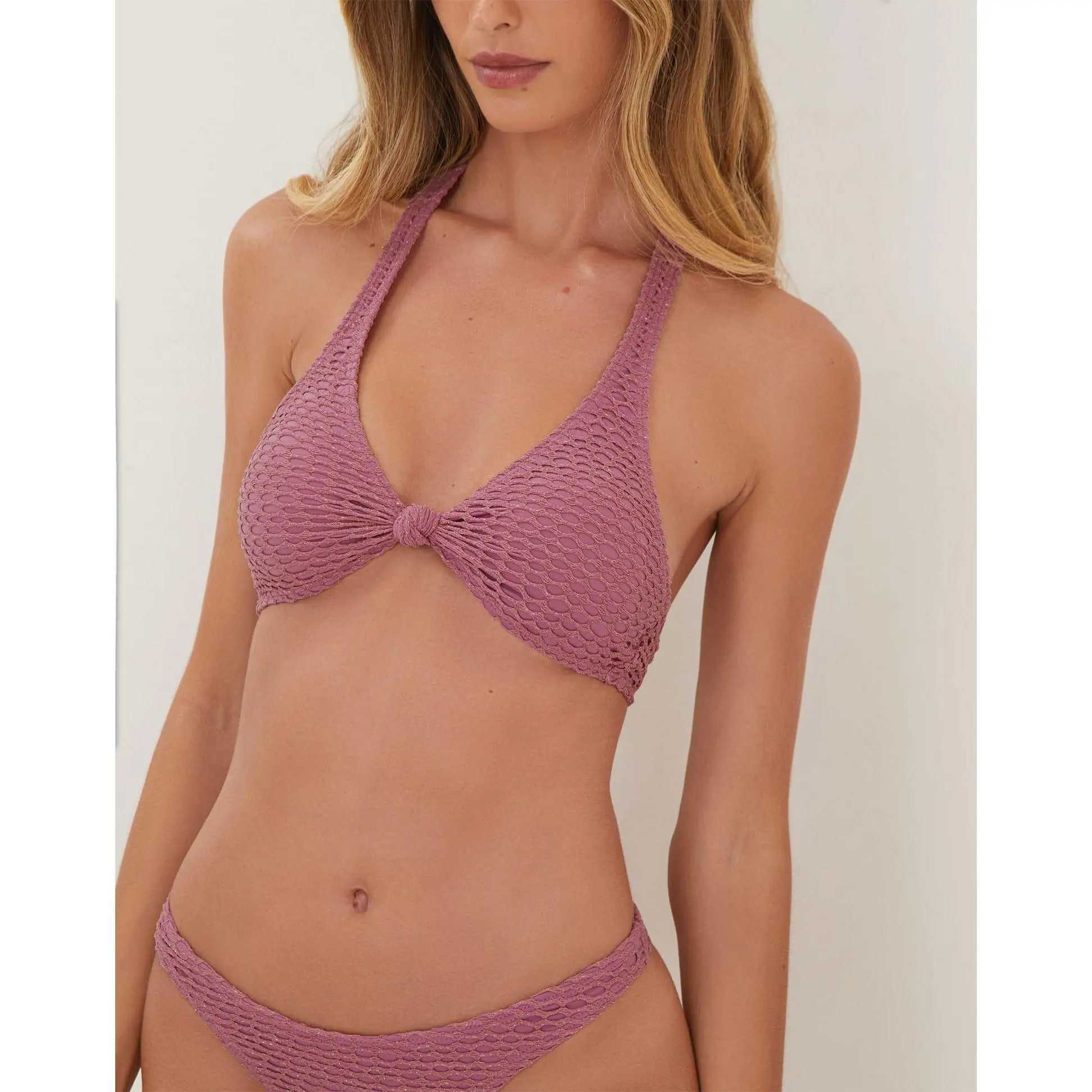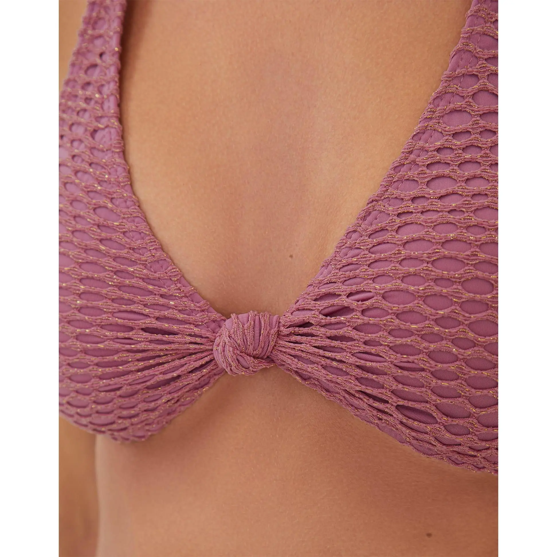 The ViX Alanna Knot Top is a halter-style bikini top with a mesh overlay and gold metallic threads throughout. It features a scoop neckline with a chic knotted detail at the bust, and adjustable tie closures at the back for a customizable fit and effortless style. Style the Alanna Knot Top with a matching bottom and a cover up for a vacation-ready look.Features: