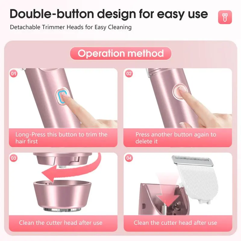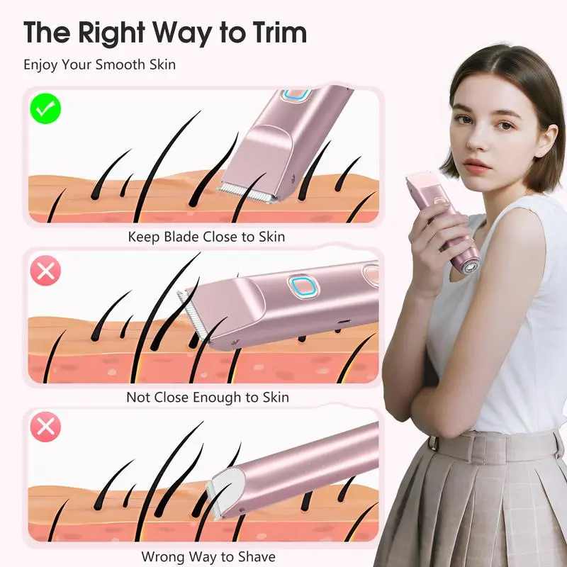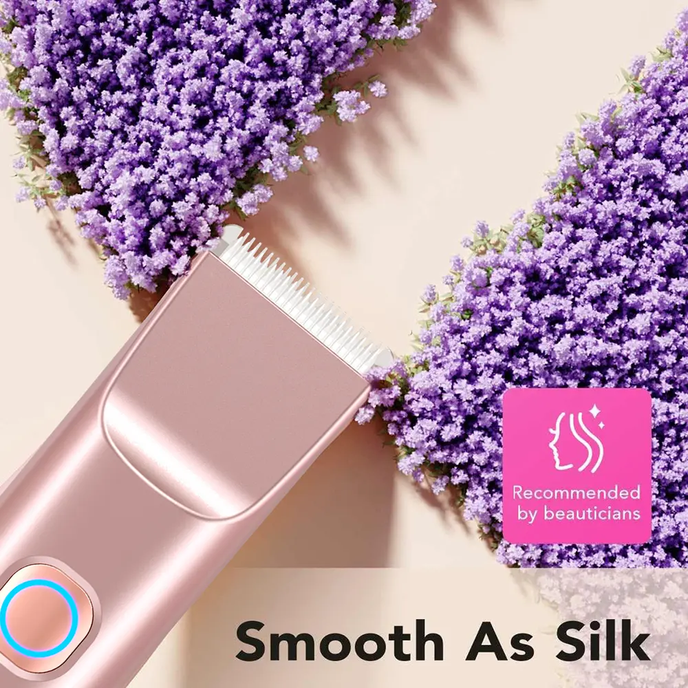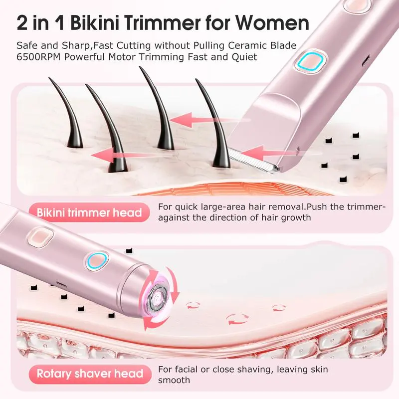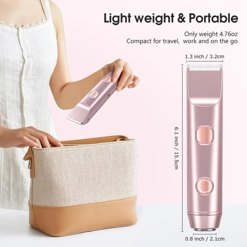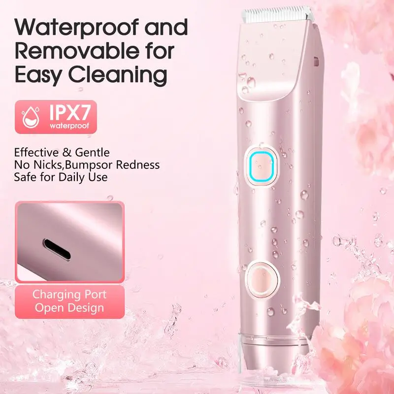 [2025 New Upgrade] Matte Peach Bikini Trimmer – Electric Razor for WomenErgonomic Design The women's shaver's handle is thoughtfully shaped for comfort and ease, fitting naturally in your hand. Accented in chic rose-gold, it's as stylish as it is functional. Perfect for a seamless grooming experience.IPX7 Waterproof No need for silicone plugs—this waterproof shaver is fully safe for bathroom use. Simplify your routine and enjoy a more relaxed experience. It's perfect for wet or dry skin.Safe & Smooth Shaving Rounded stainless-steel and rust-resistant ceramic blades glide gently, leaving skin smooth, not irritated. The motor is whisper-quiet, ensuring quiet use at night.Wet & Dry Versatility Use it in the shower or on dry skin. Cleanup is easy: rinse under water or brush off between uses. Stay convenient wherever you are.Travel-Ready for the Modern Woman Lightweight at just 136 g, it measures 6.14" at its longest edge. Slip easily into your beach bag or carry-on. The soft pouch protects and keeps it stylish.Note:Please use the included charging cable (5V, 1A) ! Do not use fast-charging cable may cause charging failure. (This note can also be found in the user manual.)