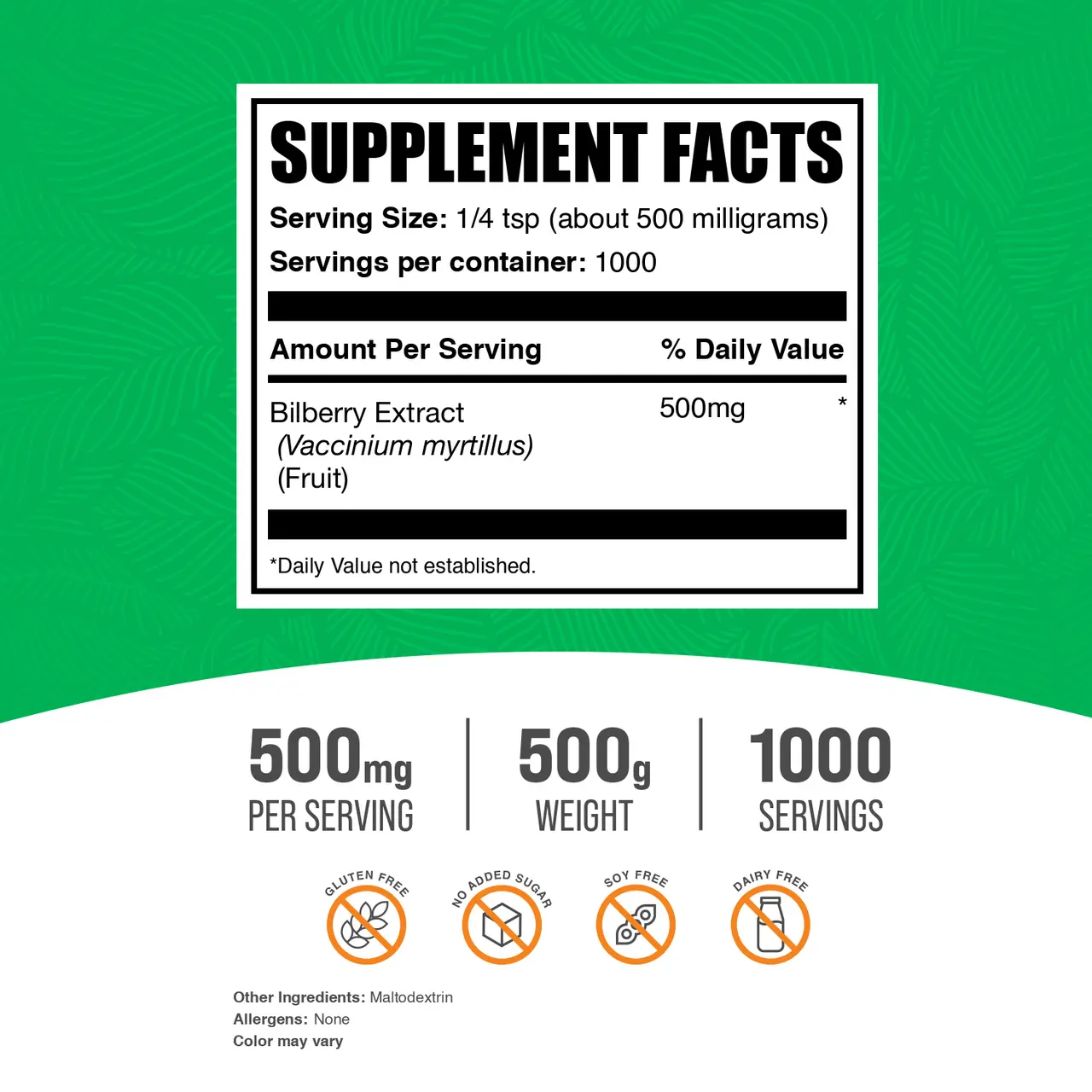 Discover the bountiful goodness of Bilberry Extract powder by BulkSupplements, a powerhouse of antioxidants which harness the potent health benefits of whole bilberries in a convenient form. Packed with the highest anthocyanin concentrations—up to four times what's found in traditional blueberries—our Bilberry Extract powder is nature's gift for supporting your overall vitality. Each serving delivers a supercharged dose of nutrition, ensuring that you seize the day with vigor.