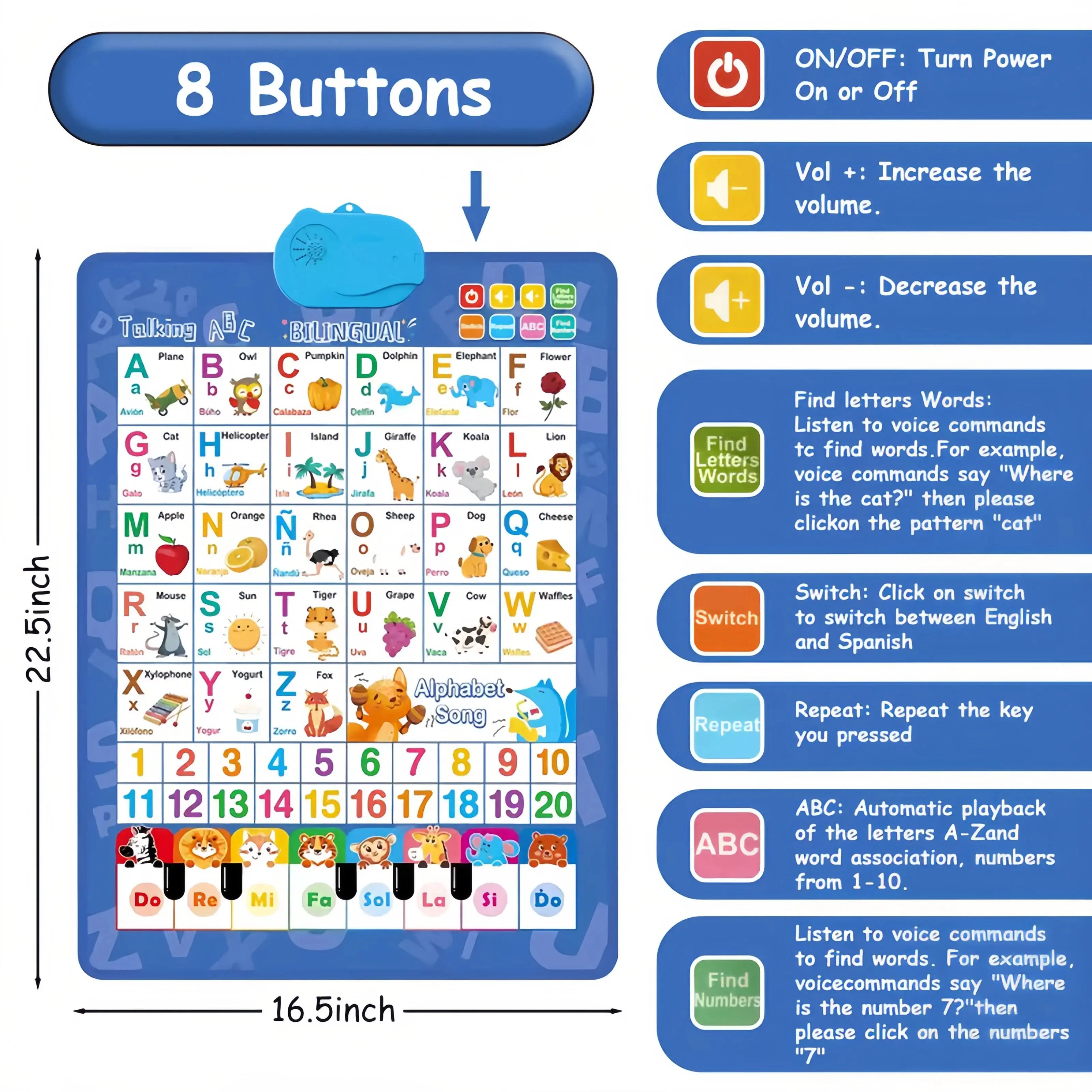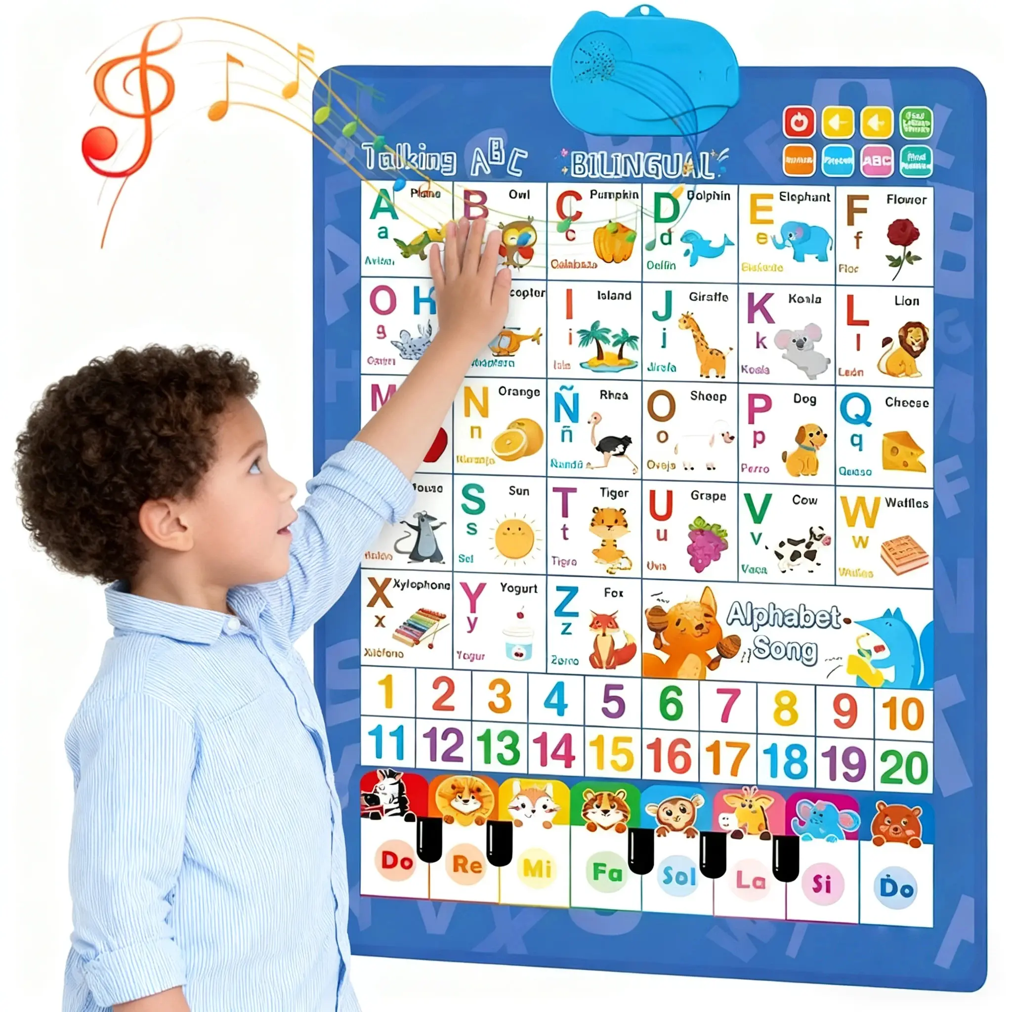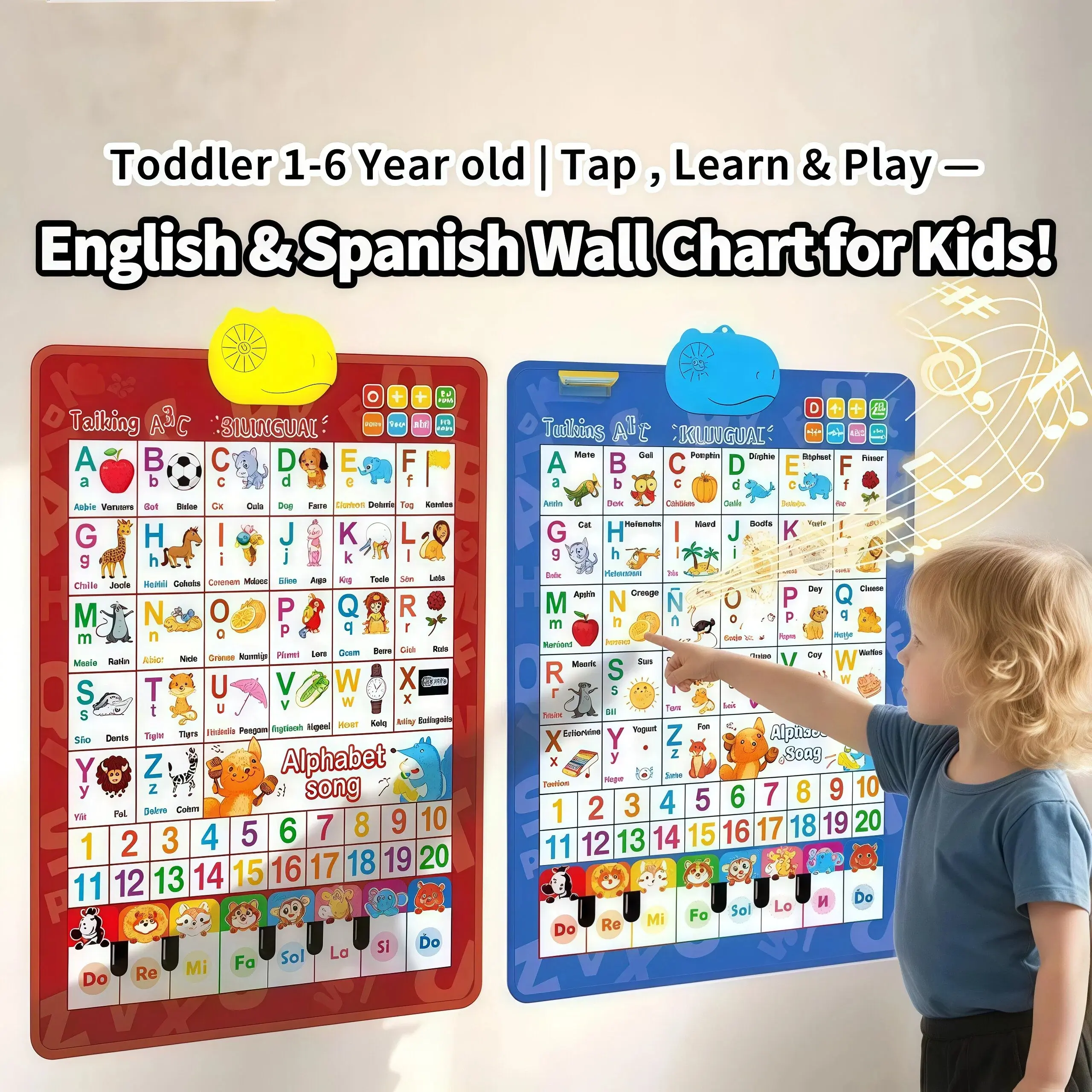 Bilingual English & Spanish Alphabet Wall Chart for Toddlers 1-6- Includes Talking ABC, 123s & Music Poster Alphabet Numbers Chart Creative Teaching Supplies Waterproof Durable Design Gift for kids