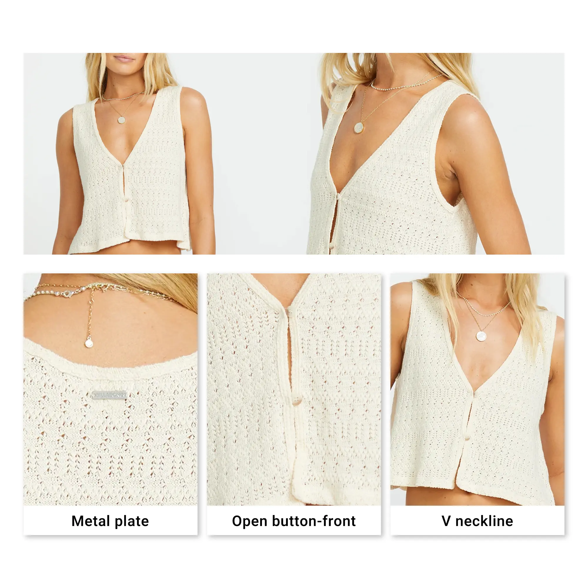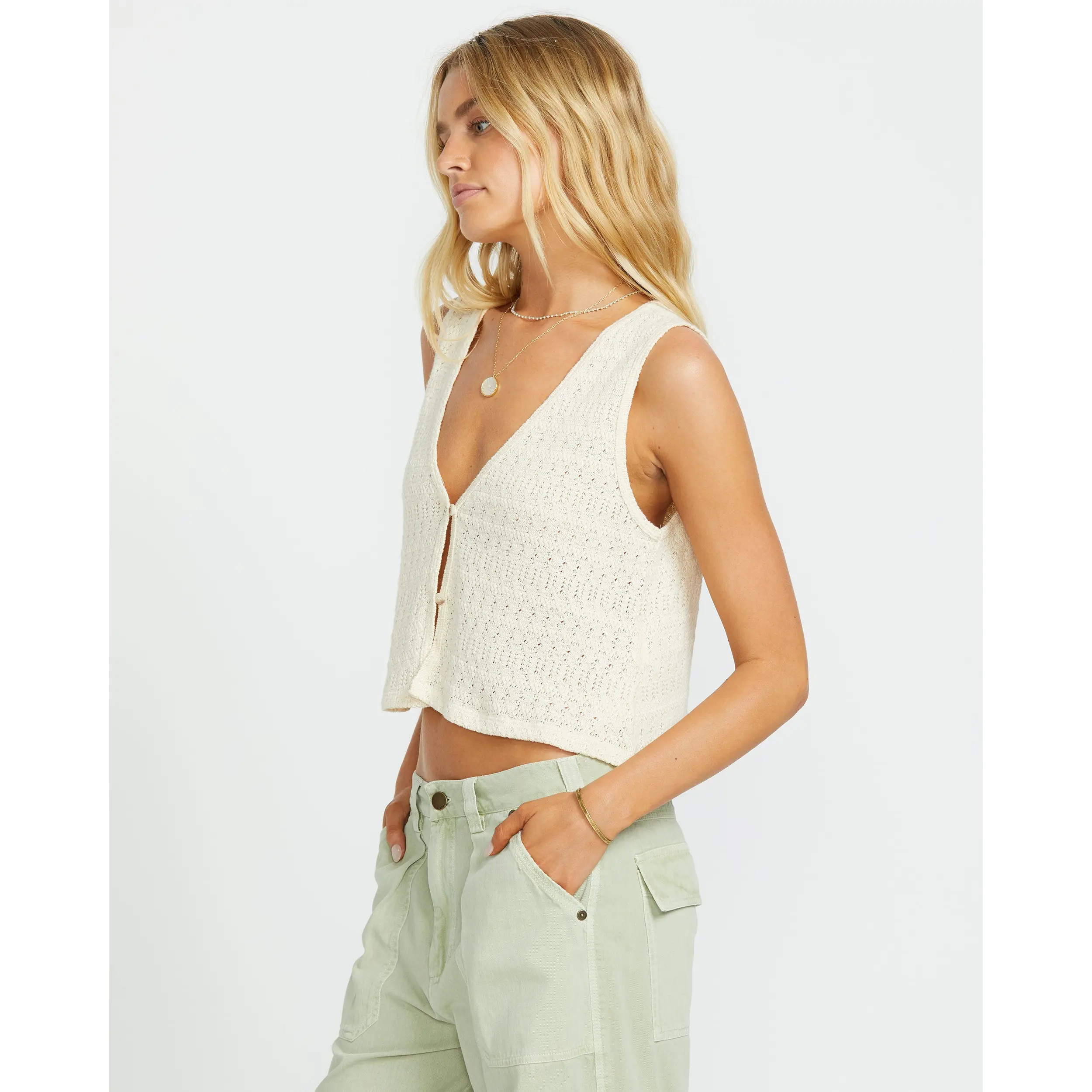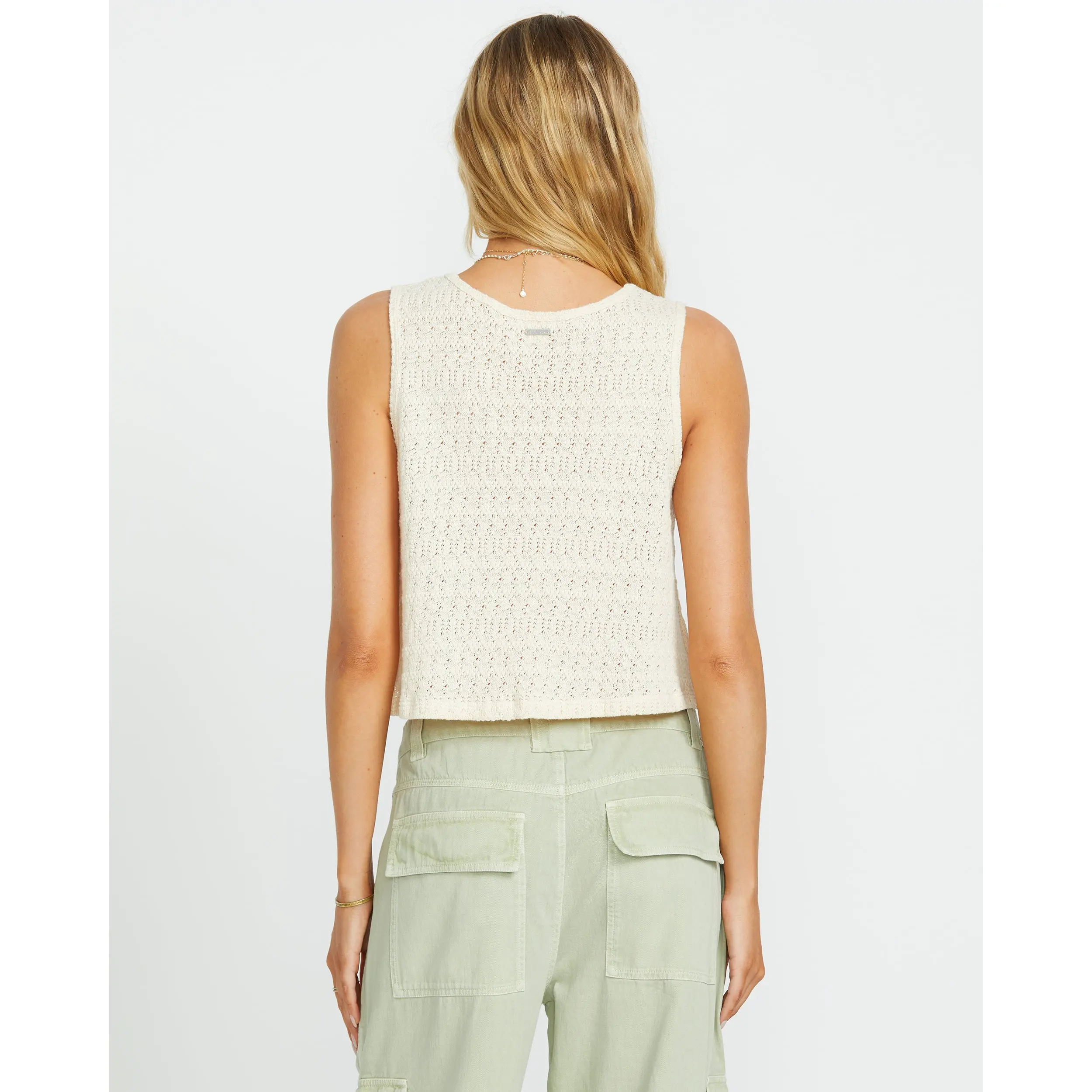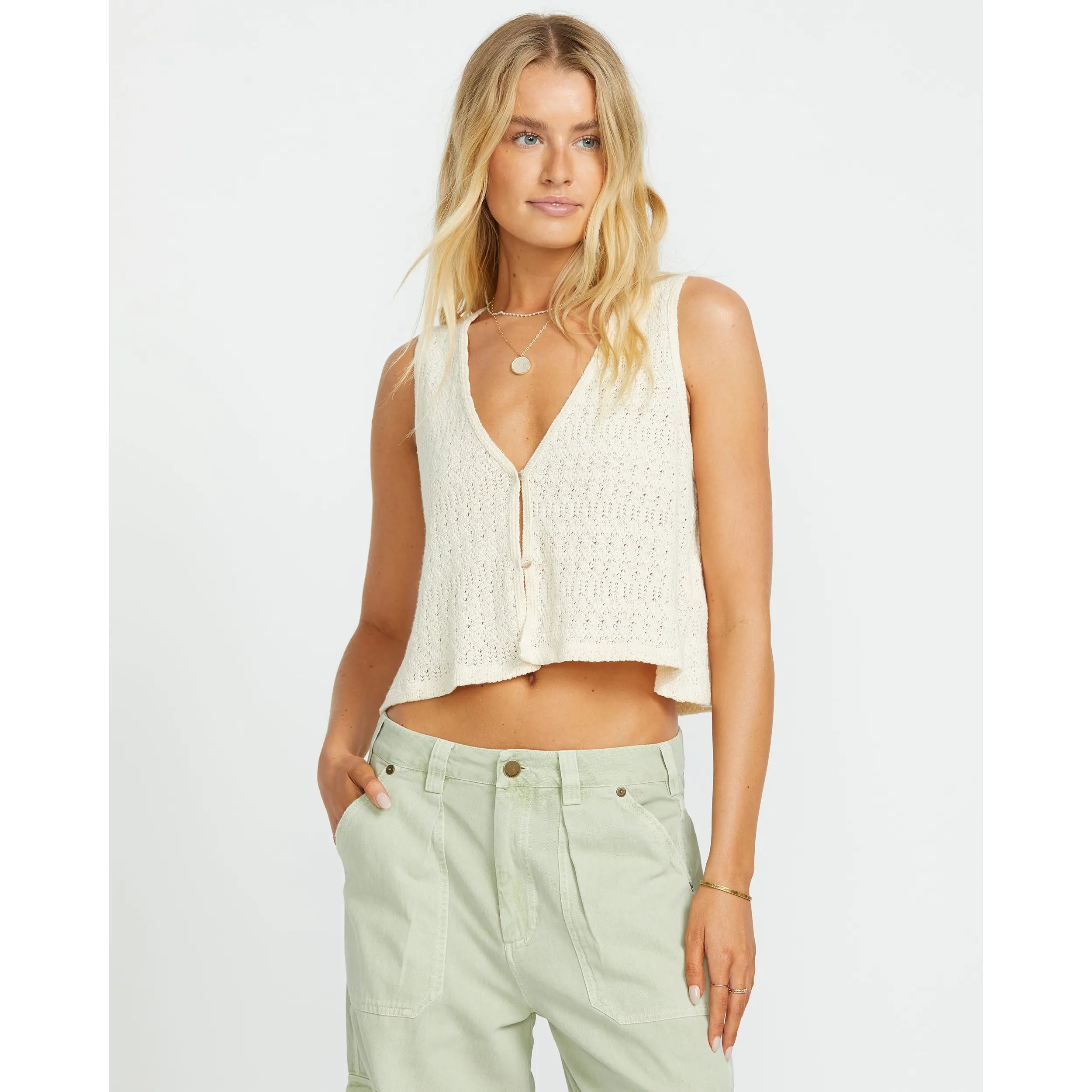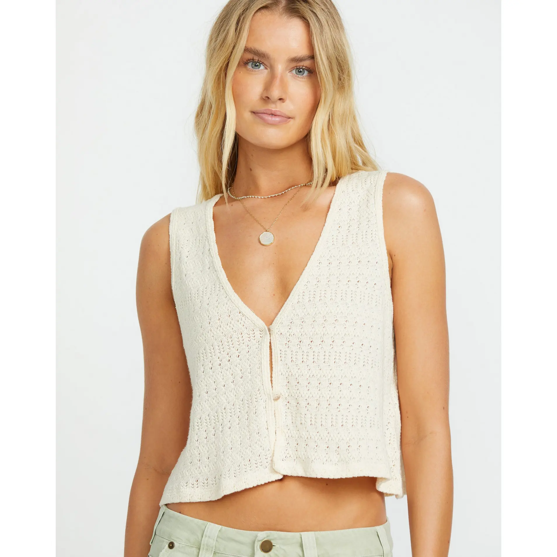 Relaxed yet stylish with Our Billabong knit tank. The 100% cotton pointelle brings breathable comfort for warm days, while the open button-front and V-neck lend an effortless look. Finished with a metal brand plate, it's a breezy essential with beachy vibes. Featured here in the Whitecap colorway.
