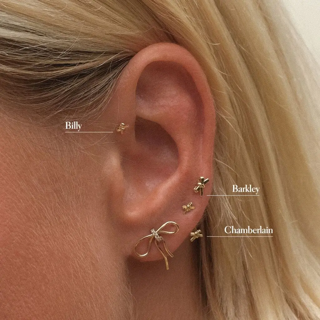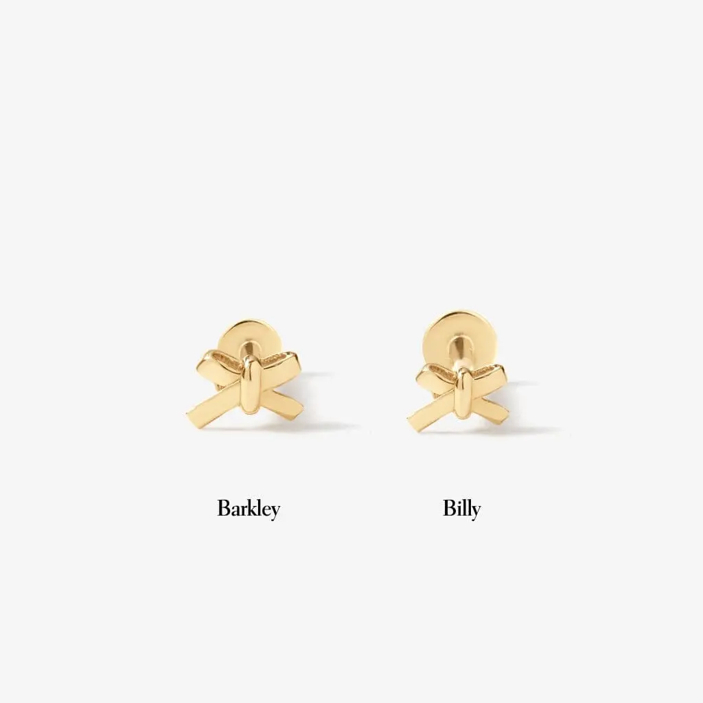 A bow so tiny, it's unforgettable. Billy's feminine touch is all wrapped up for everyday solid gold charm. This dainty bow stud brings a touch of softness to any ear stack. Created for you in 14 karat solid gold, this single piercing can stay in your ear always, even when you are in the water.