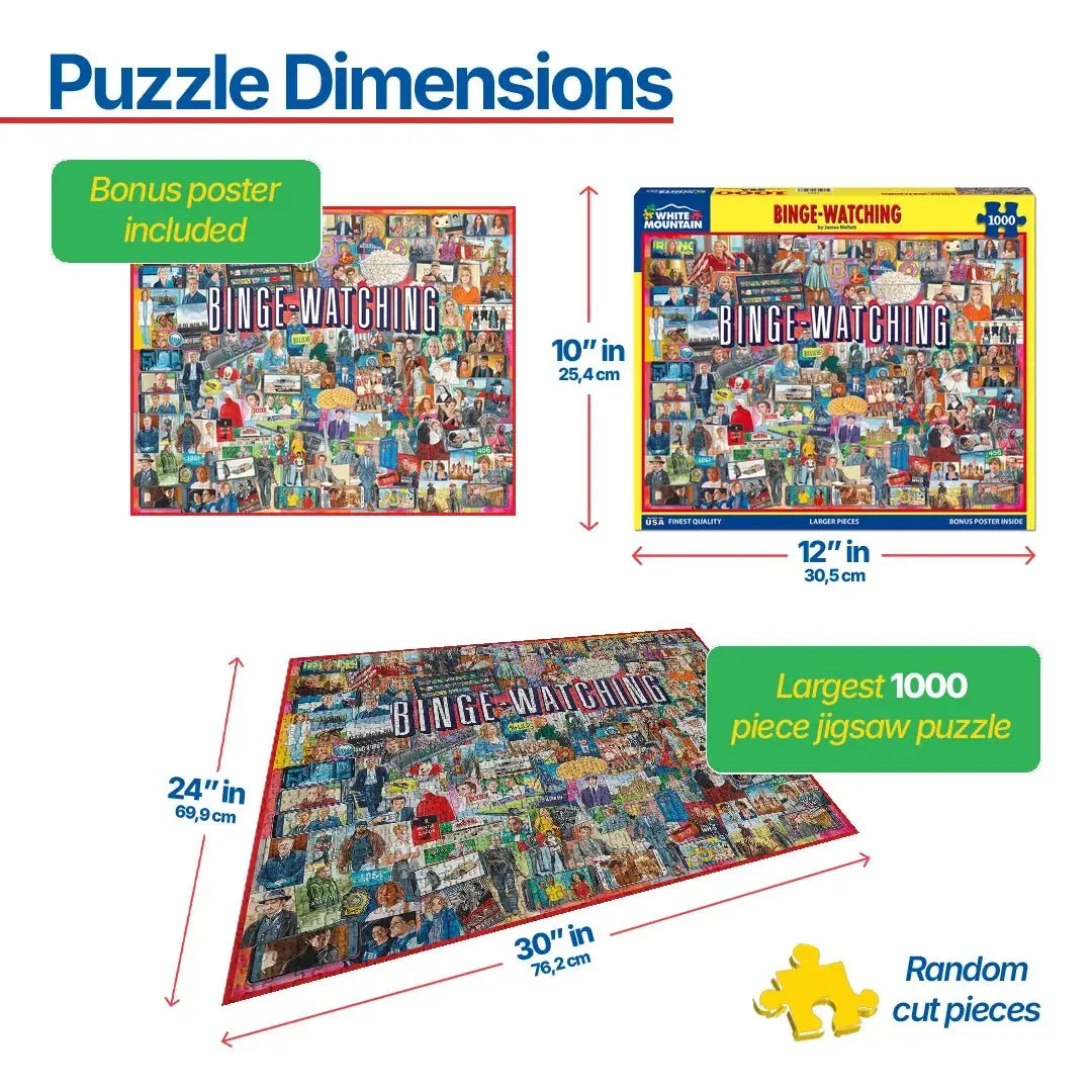 Binge-Watching - 1,000 Piece Jigsaw Puzzle Settle in for the ultimate TV marathon with this entertaining 24" x 30" celebration of must-see television. Artist James Mellett has curated a collection of beloved series from every era, creating a nostalgic tribute to those "just one more episode" moments that turn minutes into hours of viewing pleasure.