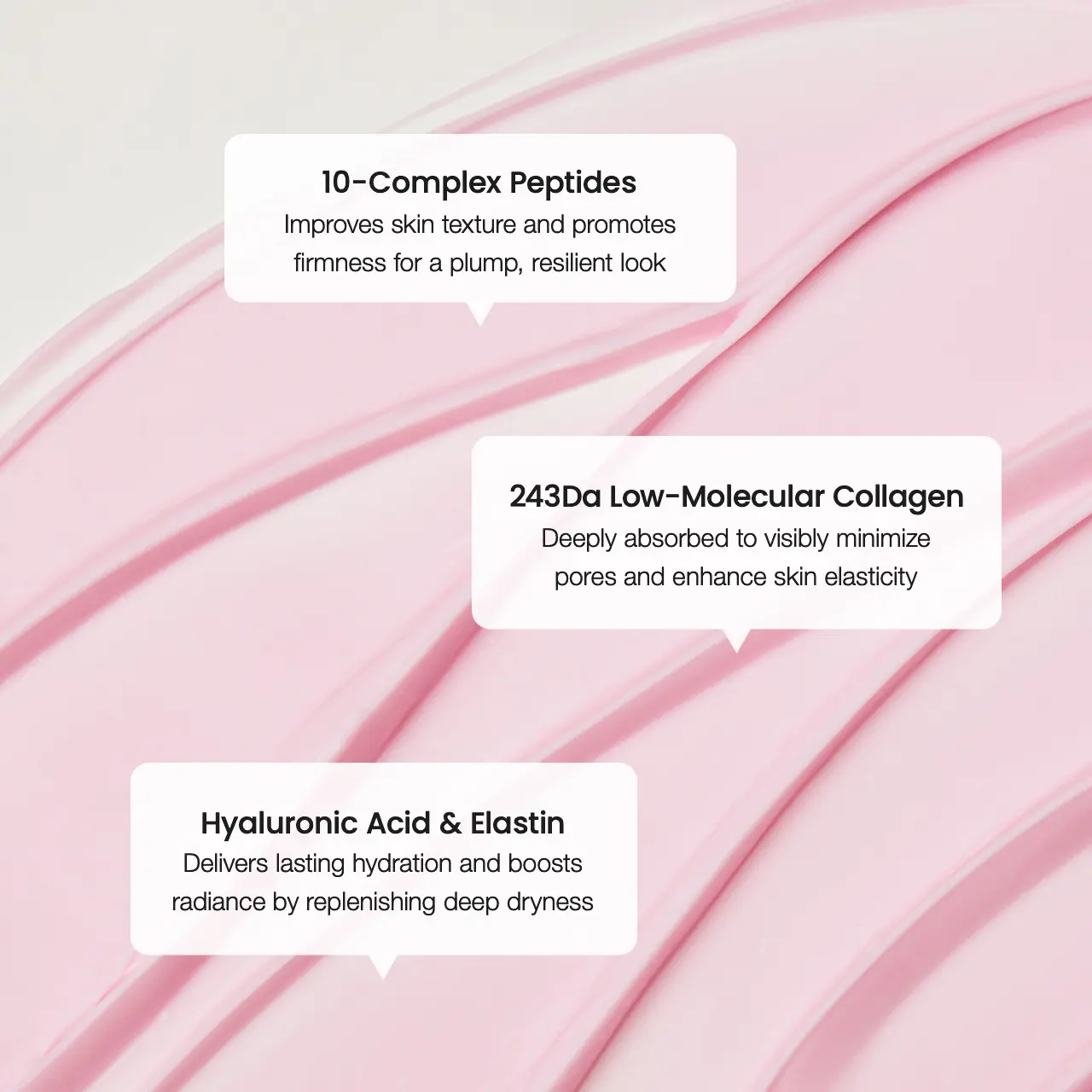 | Ingredients | Copper Tripeptide-1,Acetyl Hexapeptide-8,Palmitoyl Pentapeptide-4,Palmitoyl Tripeptide-38,Pentapeptide-4,Palmitoyl Tripeptide-5,Hexapeptide-9,Hexapeptide-12,Tripeptide-1,sh-Oligopeptide-1,Potassium Hyaluronate,Sodium Hyaluronate Crosspolymer,Hydrolyzed Sodium Hyaluronate,Hyaluronic Acid,Hydrolyzed Hyaluronic Acid,Sodium Acetylated Hyaluronate,Soluble Elastin,Hydrolyzed Elastin,Hydroxypropyltrimonium Hyaluronate,Elastin,Caprylyl Glycol,Silanetriol,Pentylene Glycol,Alginic Acid,Sodium Hyaluronate,Collagen Extract,Butylene Glycol,Propanediol,Tocopherol,Cyanocobalamin,Panthenol,Disodium EDTA,Sorbitan Oleate,Caprylyl/Capryl Glucoside,Adenosine,Ethylhexylglycerin,Sodium Polyacrylate,Polyisobutene,Sodium Acrylate/Sodium Acryloyldimethyl Taurate Copolymer,Water,Dimer Dilinoleyl Dimer Dilinoleate,Sorbitan Olivate,Glyceryl Stearate,Hydrogenated Poly(C6-14 Olefin),Cetearyl Olivate,Simethicone,Hydrogenated Polydecene,Niacinamide,Cetearyl Alcohol,1,2-Hexanediol,Triethylhexanoin,Neopentyl Glycol Diheptanoate,Diphenyl Dimethicone,Methylpropanediol,Glycerin,Collagen Water |