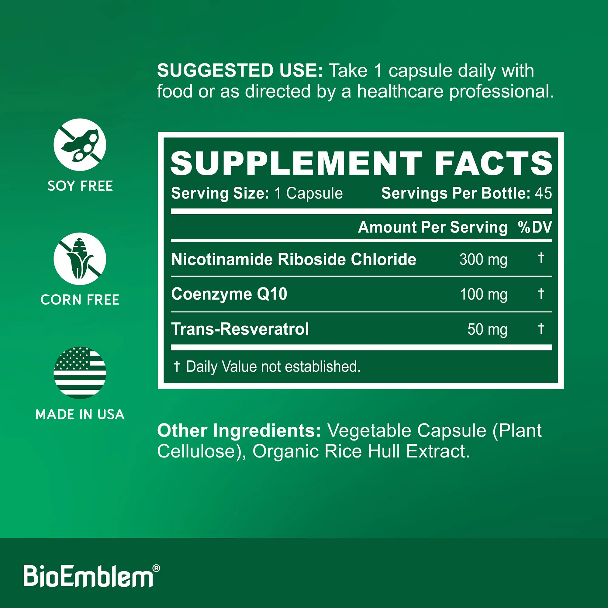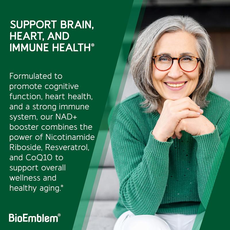 Crafted in a cGMP-certified facility, BioEmblem NAD+ is free from GMOs, gluten, and artificial additives. Every capsule is made with care for your health and wellness.