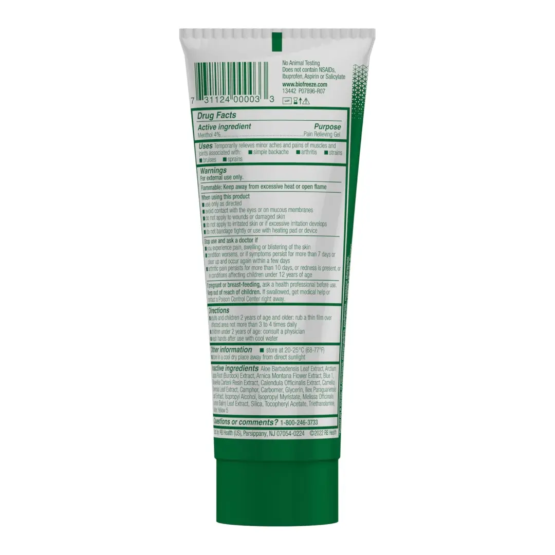 Ease your aches and pains with biofreeze pain relief gel. Our fast acting, long lasting, cooling menthol formulation delivers powerful penetrating pain relief for sore muscles and joints, simple backaches, arthritis, strains, bruises and sprains. Biofreeze gel is easy to apply to small and large muscle areas without the need for a dosing card. This convenient, 3 fl oz gel tube is tsa-friendly and perfect for on-the-go pain relief. Whether you need a fast acting formula to target your knee pain, neck pain, shoulder pain, hip pain, arthritis pain, or pain during muscle recovery, look no further than biofreeze. how does it work? pain happens when your receptors send a signal from your spine to your brain. Cold sensations, like menthol, stimulate receptors to block those signals to relieve pain. biofreeze offers a variety of pain relief formats to suit your lifestyle, such as pain relief patches, spray, cream, roll on, foam, and gel. Don't let pain interrupt your day - choose biofreeze instead. **bishop, bn, et al. The short-term effects of 2 different cryotherapy methods on acute and subacute, noncomplicated bilateral neck pain. J perform health res. 2017;1:11-17.