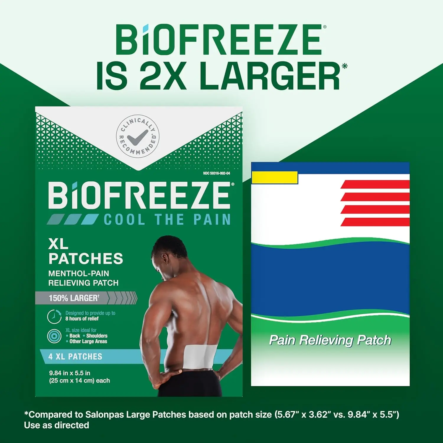 ·150% LARGER PAIN RELIEF PATCHES: Biofreeze XL Patches are 150% larger than Biofreeze Large Patches, making them ideal for back, shoulders, and other large areas; Each patch measures 9.84 x 5.5 inches
