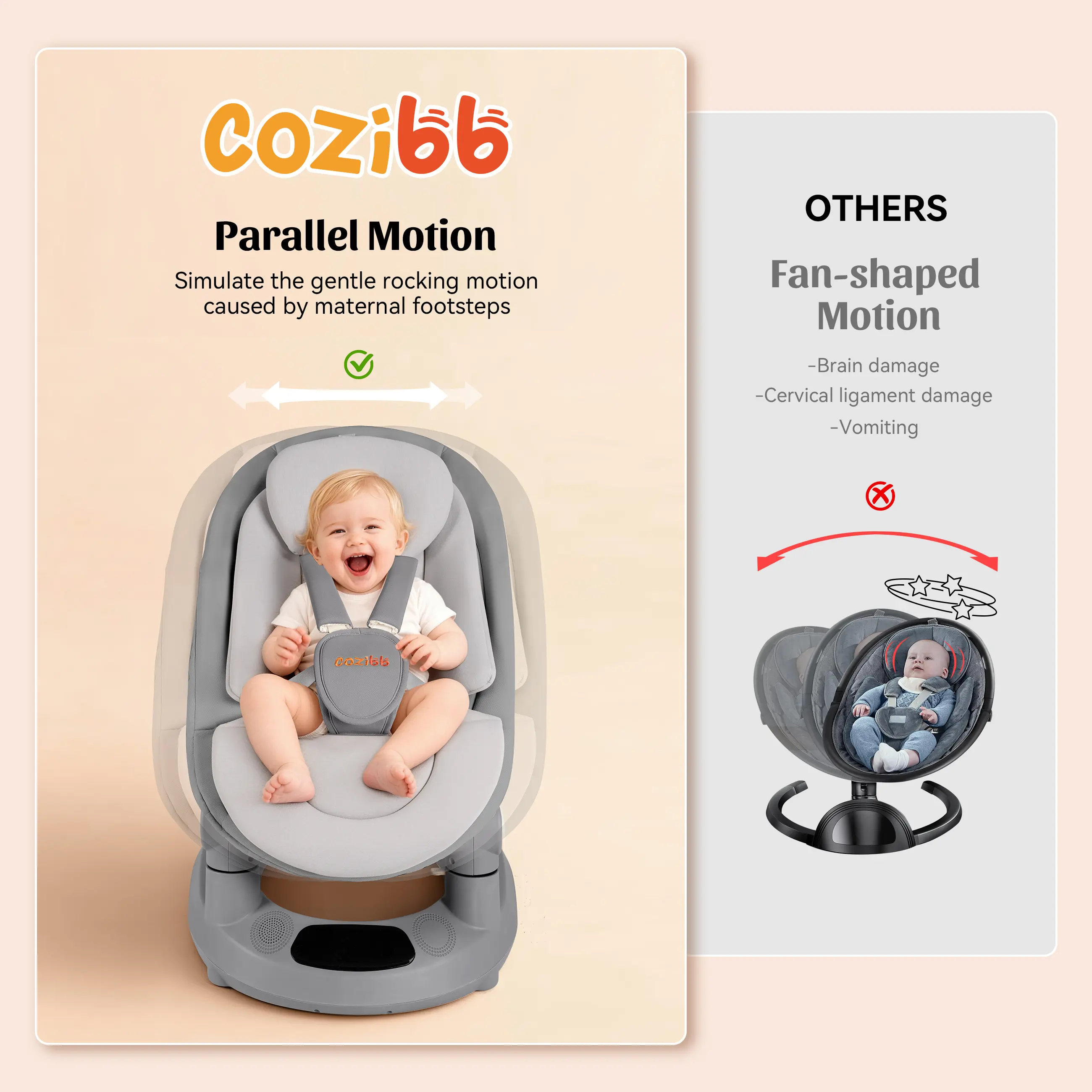 Gentle Rocking: The parallel rocking motion keeps the baby's body in a horizontal position, with the head and torso relatively still, preventing repetitive neck flexion and extension.