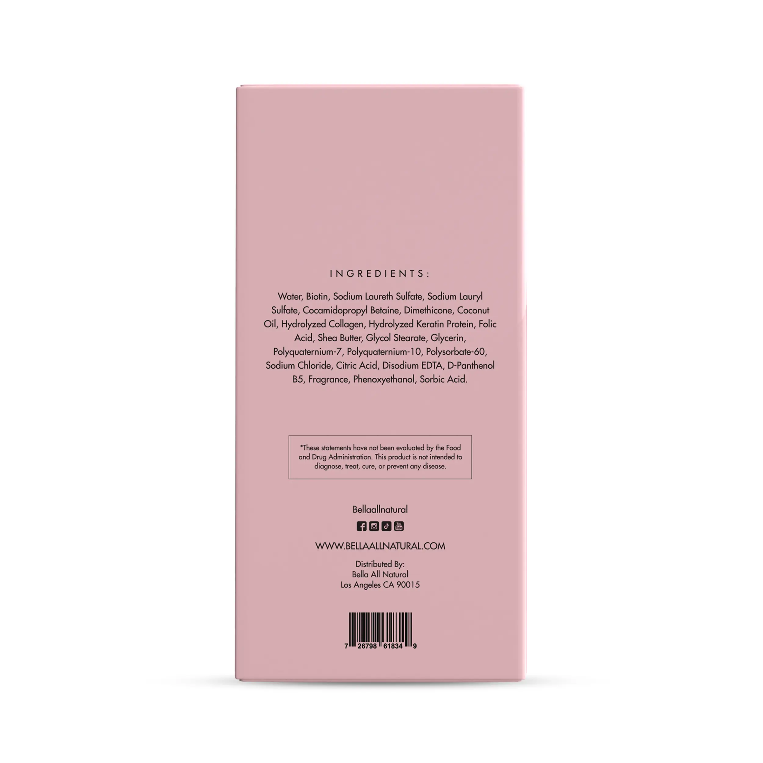 Water, Biotin, Sodium laureth sulfate, Sodium lauryl sulfate, Cocamidopropyl betaine, Dimethicone, Coconut oil, Hydrolyzed collagen, Hydrolyzed keratin protein, Folic acid, Shea butter, Glycol Stearate, Glycerin, Polyquaternium-7, Polyquaternium-10, Polysorbate-60, Sodium chloride, Citric acid, Disodium EDTA, D-Panthenol B5, Fragrance, Phenoxyethanol, Sorbic acid.
