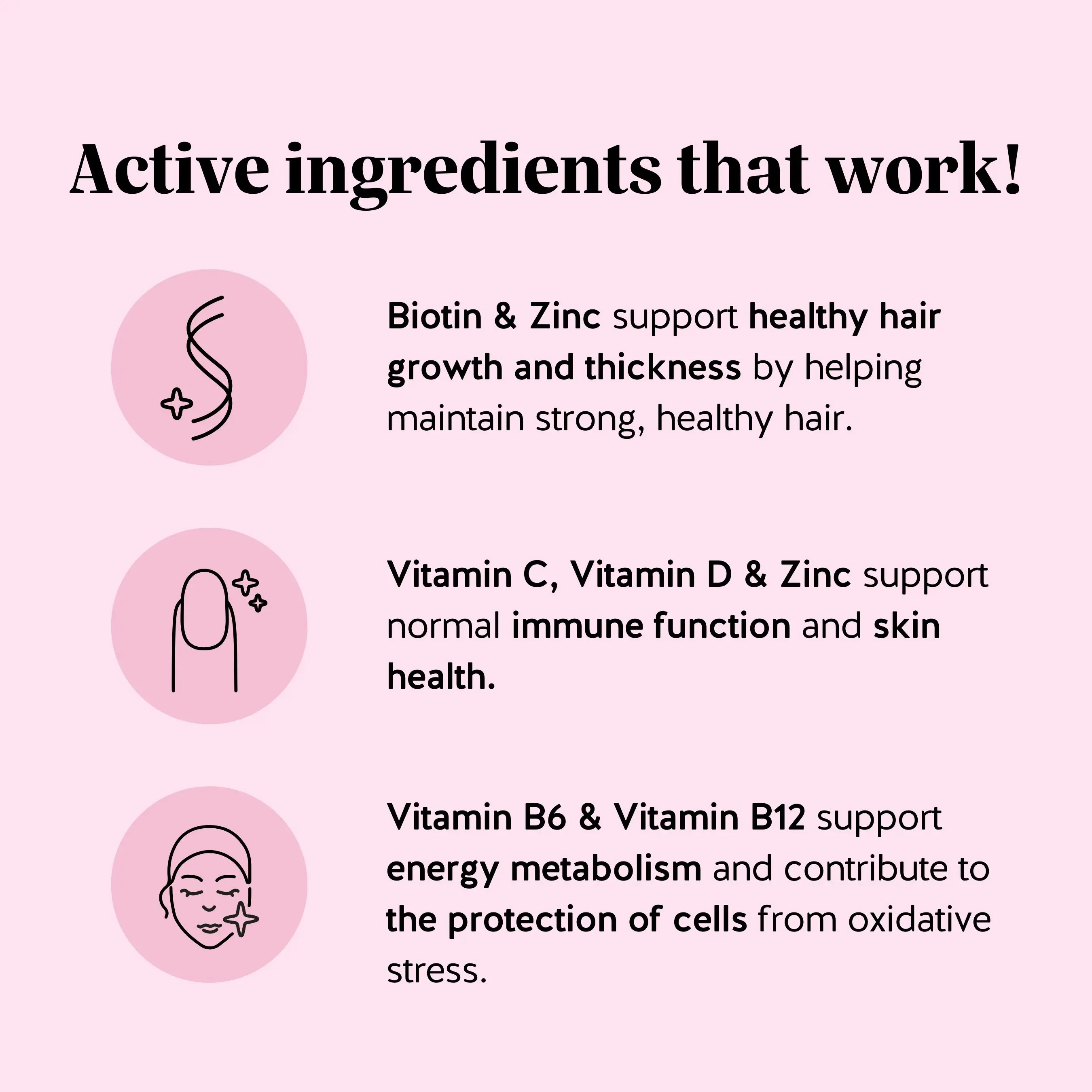 Zinc for extra strength – Prevents nail brittleness and supports hair growth and repair.