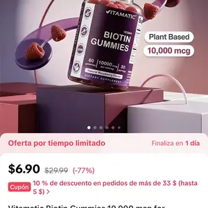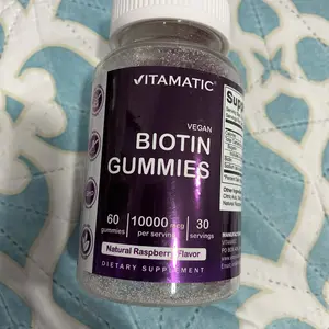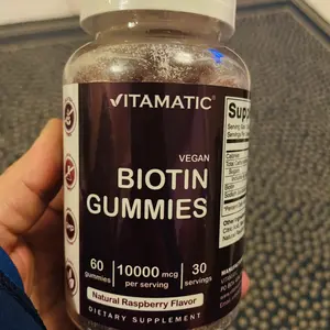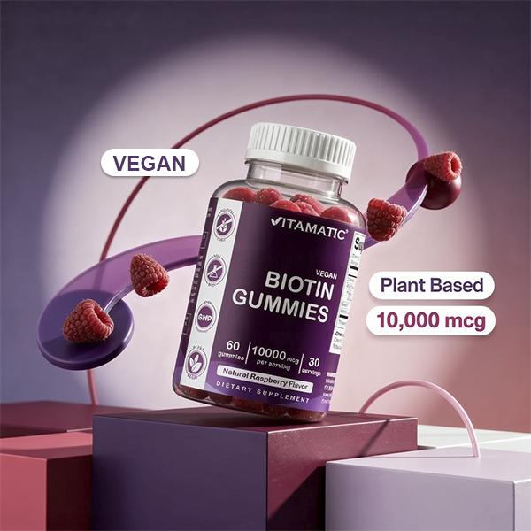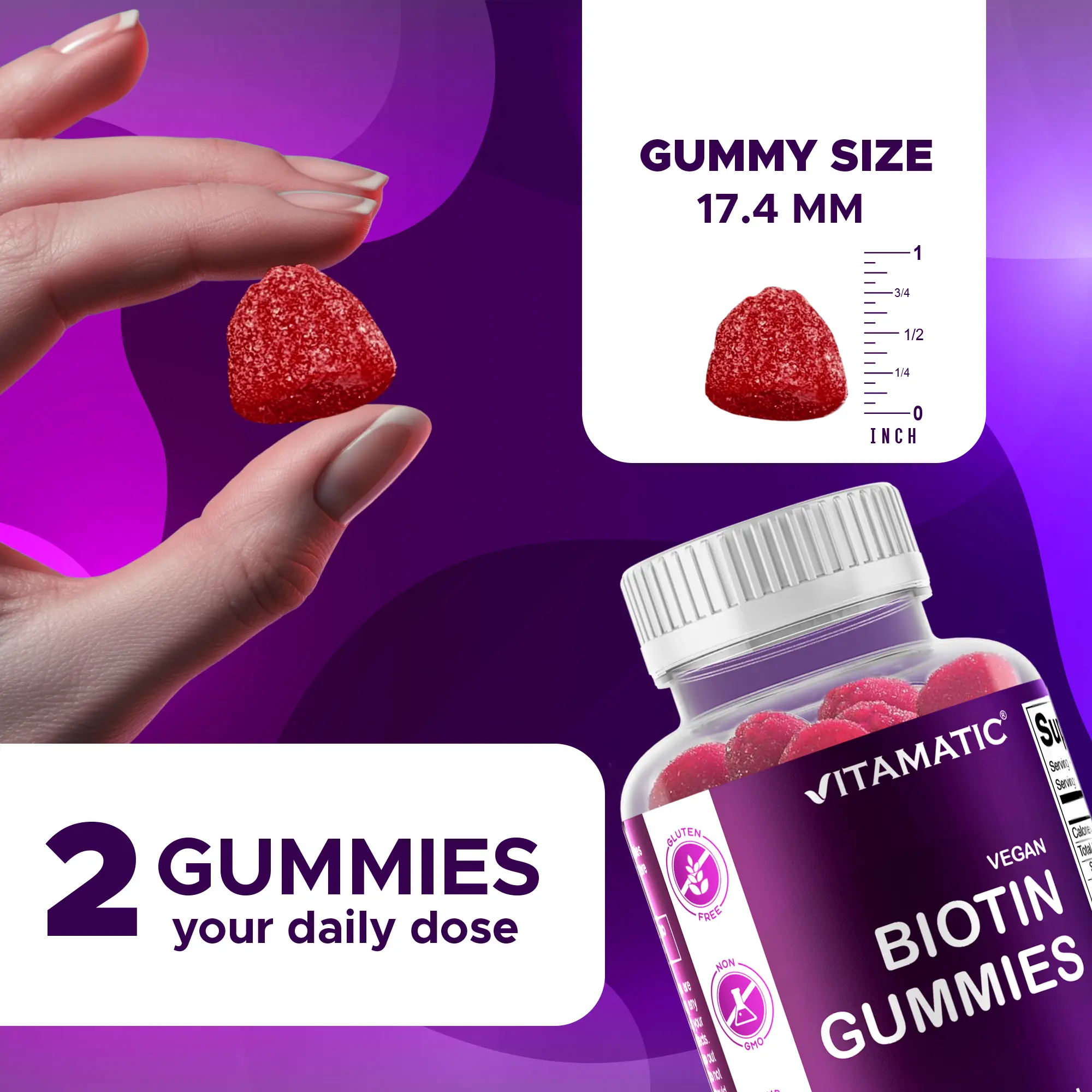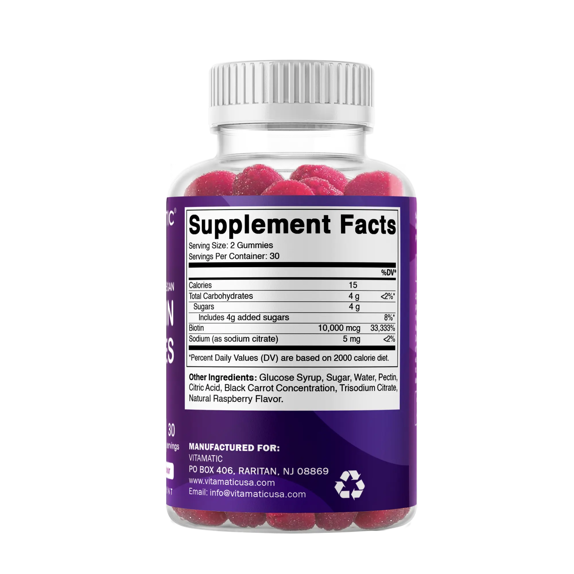 Enjoy the delightful natural raspberry flavor of Vitamatic Biotin Gummies. Each gummy delivers 10 mg of biotin per serving, ensuring a tasty and effective supplement. Avoid unpleasant aftertastes from large biotin capsules or pills.