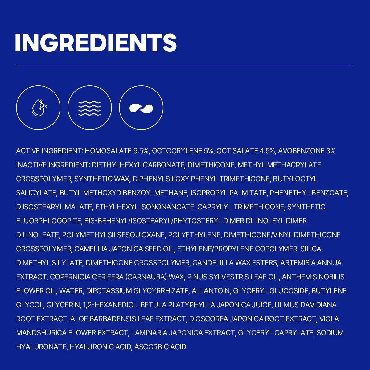 | Ingredients | Active Ingredient: Homosalate 9.5%,Octocrylene 5%,Octisalate 4.5%,Avobenzone 3% Inactive Ingredient: Diethylhexyl Carbonate,Dimethicone,Methyl Methacrylate Crosspolymer,Synthetic Wax,Diphenylsiloxy Phenyl Trimethicone,Butyloctyl Salicylate,Butyl Methoxydibenzoylmethane,Isopropyl Palmitate,Phenethyl Benzoate,Diisostearyl Malate,Ethylhexyl Isononanoate,Caprylyl Trimethicone,Synthetic Fluorphlogopite,Bis-Behenyl/Isostearyl/Phytosteryl Dimer Dilinoleyl Dimer Dilinoleate,Polymethylsilsesquioxane,Polyethylene,Dimethicone/Vinyl Dimethicone Crosspolymer,Camellia Japonica Seed Oil,Ethylene/Propylene Copolymer,Silica Dimethyl Silylate,Dimethicone Crosspolymer,Candelilla Wax Esters,Artemisia Annua Extract,Copernicia Cerifera (Carnauba) Wax,Pinus Sylvestris Leaf Oil,Anthemis Nobilis Flower Oil,Water,Dipotassium Glycyrrhizate,Allantoin,Glyceryl Glucoside,Butylene Glycol,Glycerin,1,2-Hexanediol,Betula Platyphylla Japonica Juice,Ulmus Davidiana Root Extract,Aloe Barbadensis Leaf Extract,Dioscorea Japonica Root Extract,Viola Mandshurica Flower Extract,Laminaria Japonica Extract,Glyceryl Caprylate,Sodium Hyaluronate,Hyaluronic Acid,Ascorbic Acid |