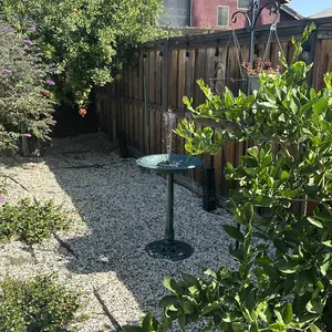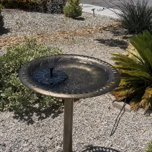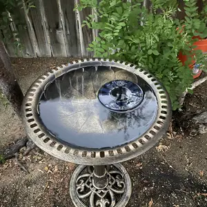 Solar Fountain--Little solar fountain sends the cutest arch of water when the sun hits. The rim has little oval cut-outs, so the smaller birds can grab it with their toes when they lean over to get a drink.