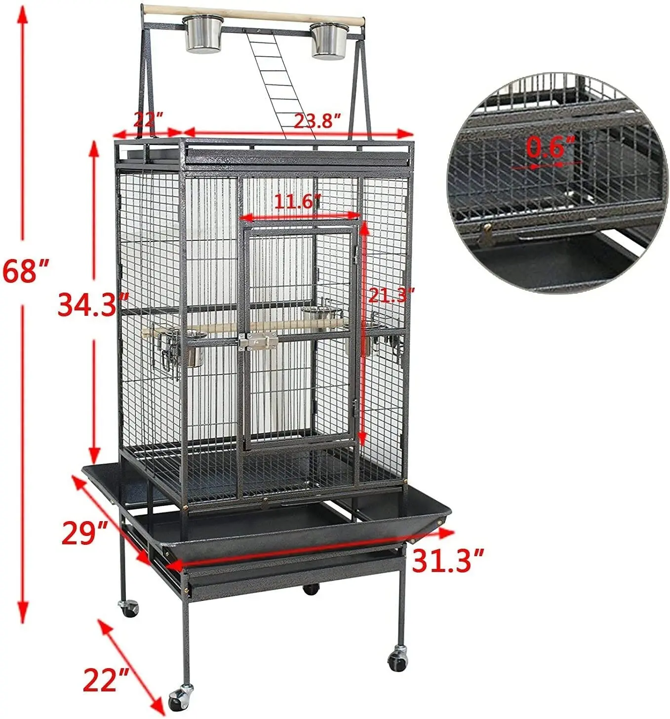 Spacious & Comfy: Overall Size W/ Stand: 31.1 in L x 29 in W x 68 in H| Door Size: 21.3 in L x 11.6 in W | This 68" tall birdcage has a 1.5cm/0.6 hardwood perch, suitable for multiple small/medium birds such as Lovebirds, Cockatiels, Parakeets, and budgies.