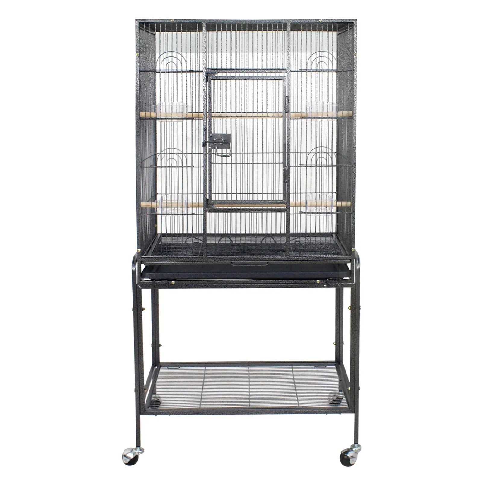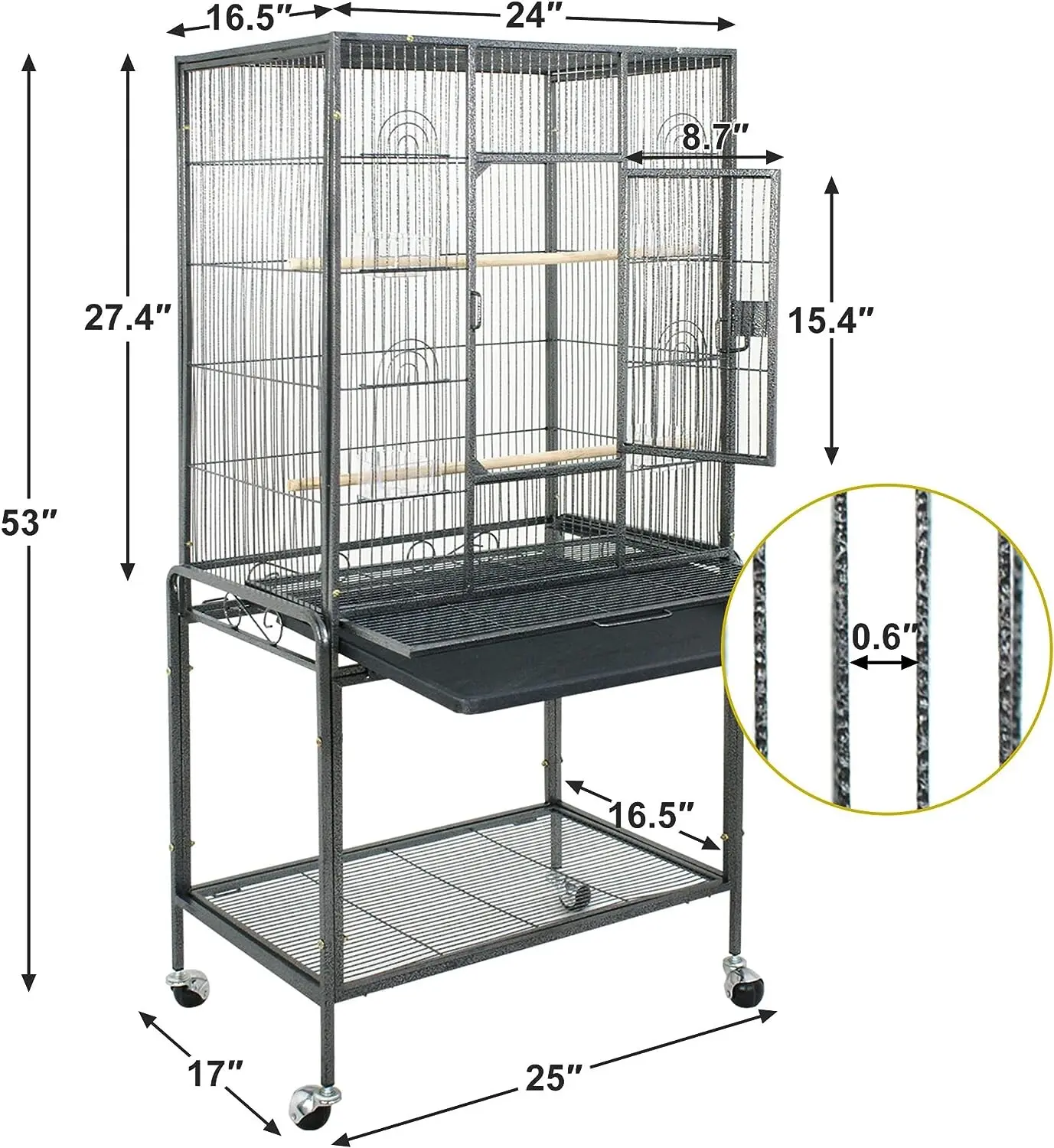 Spacious & Comfy: Overall Size W/ Stand: 25’’ L x 17’’ W x 53’’ H | Door Size: 15.4’’ L x 8.7 ’’ W | This 53-inch birdcage with a hardwood perch is roomy enough for multiple small to medium-sized birds such as Lovebirds, Cockatiels, Parakeets, and budgies.