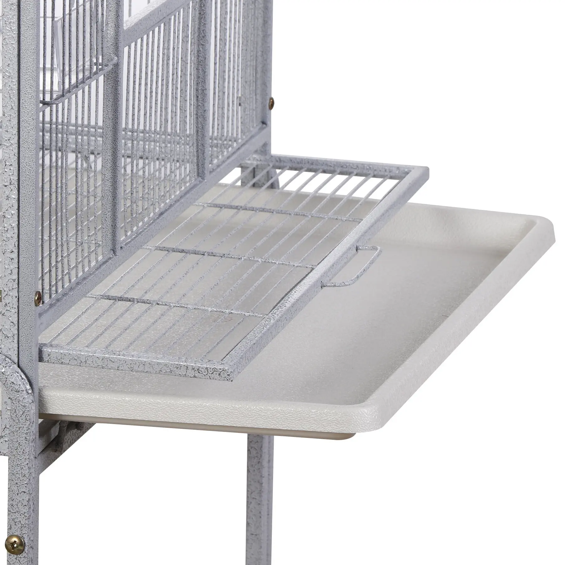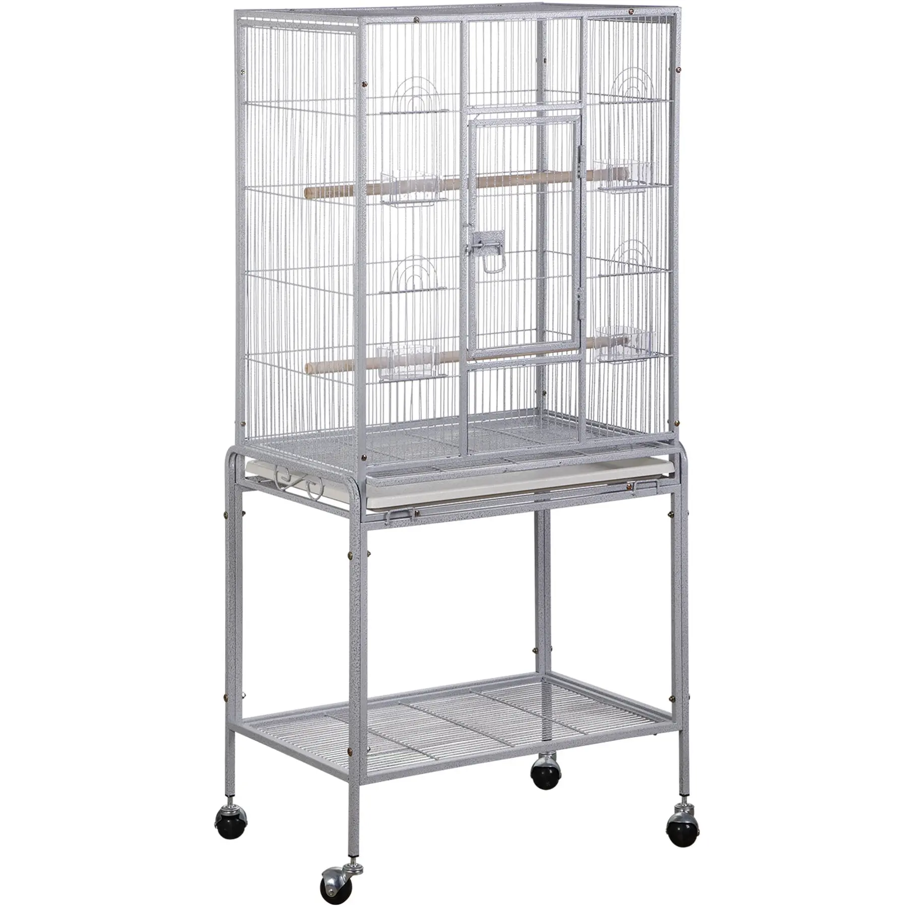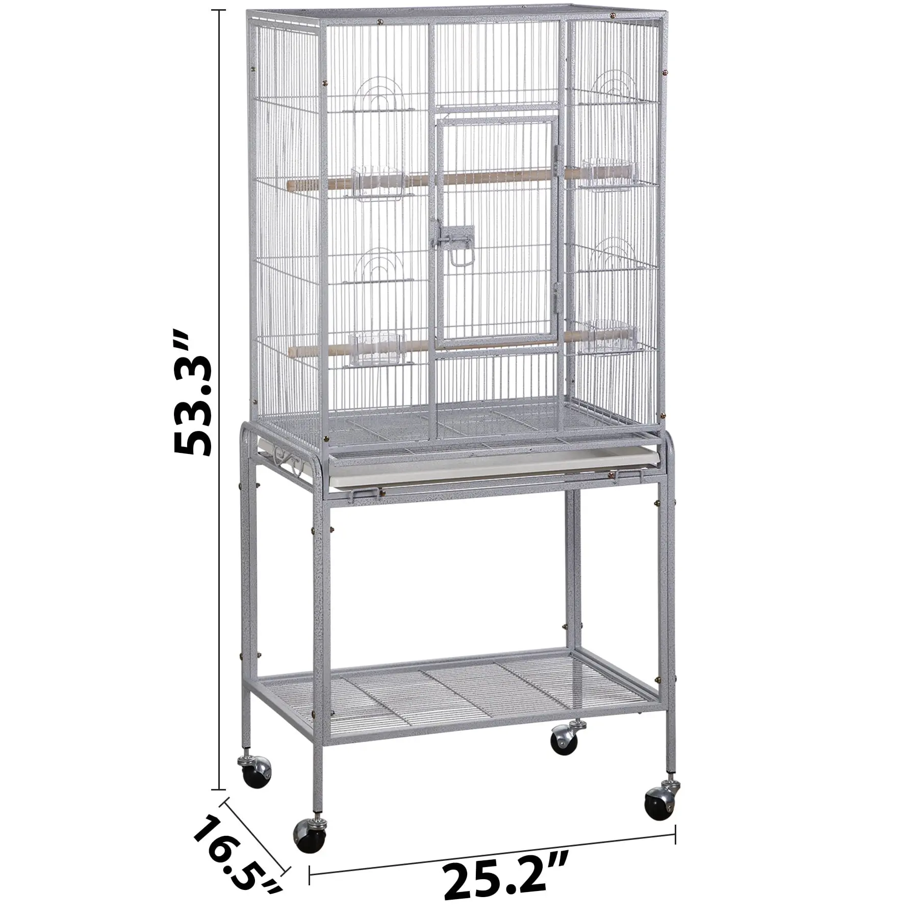 SUPERDEAL Bird Cage features one large front door and a bottom shelf for additional storage space, this flight cage stands on rolling casters and is easily moved from room to room. Four plastic double cups and 2 wood perches are included in this economical extra large cage. Our bird cage is 25.2-inch long, 17-inch wide and 53-inch high with 1/2-inch wire spacing, makes the perfect home for multiple parakeets, canaries or finches. This bird cage with stand is the ideal size for Caciques, Conures, Jardine’s Parrot, Meyer's Parrots, Pionus, Poicephalus, Red-bellied and other similar size birds to perch and live comfortably.
