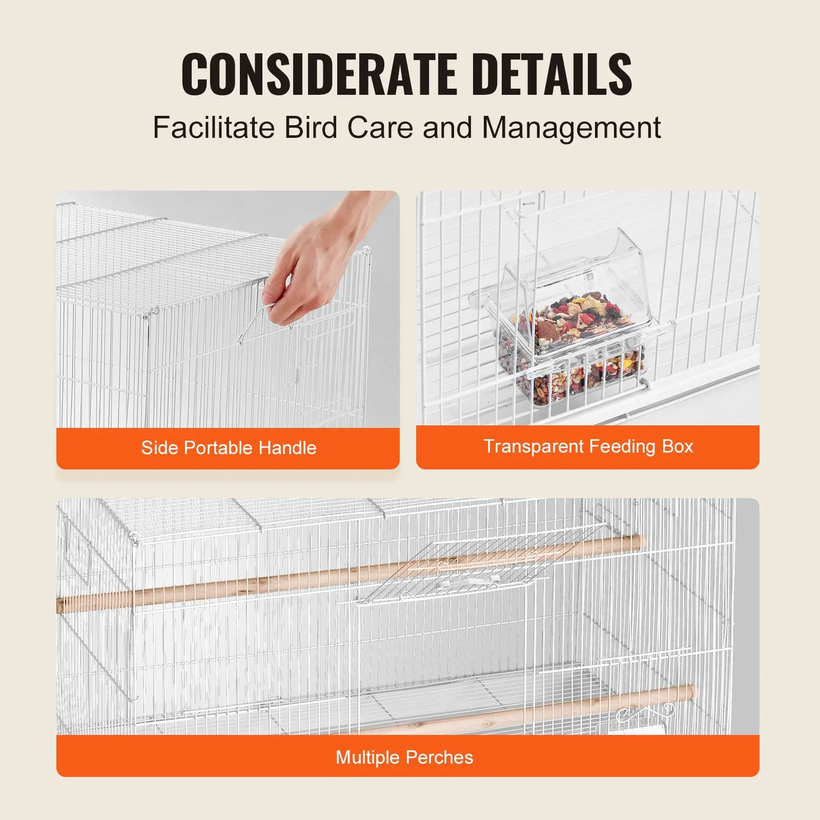 • Convenient Details: This bird cage is equiped with perches, clear feeding box, and side handles for easy position adjustment to enhance your experience.