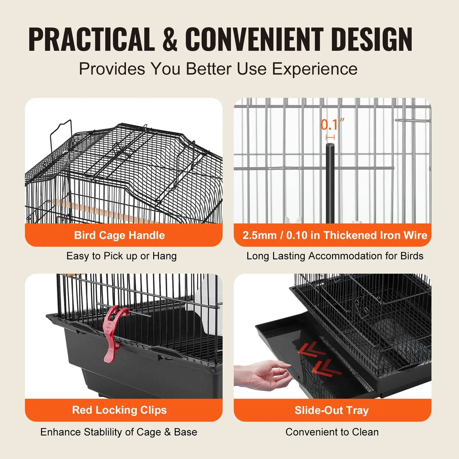 ·Sturdy Build: Constructed from premium iron wire and PP material, the parrot cage features a thickened wire diameter of 2.6 mm / 0.1 in, coated with anti-corrosive paint.