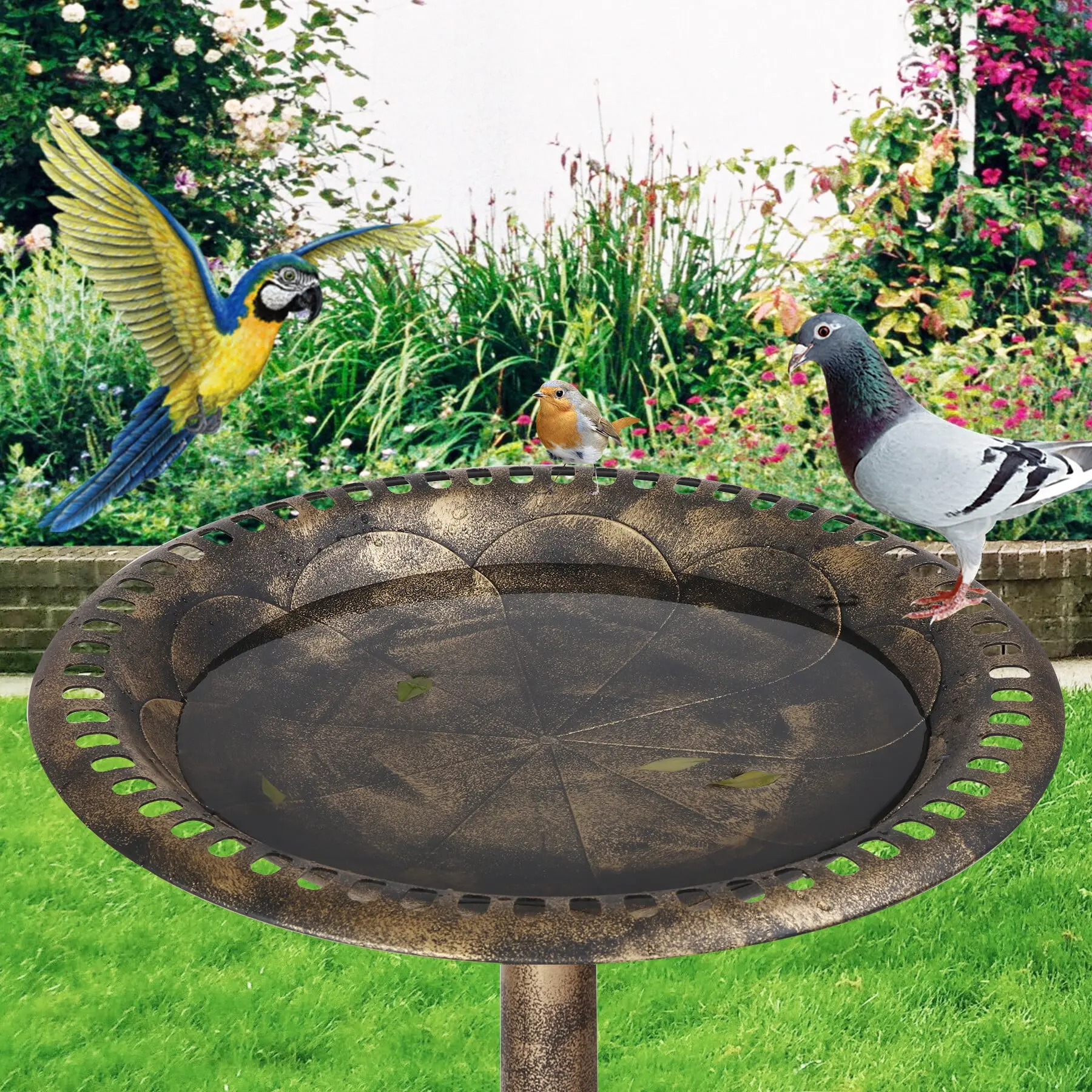 Designed with a round bowl, it provides ample room for birds to drink or bathe comfortably. The bowl's edge features eyelets that serve as perches for birds and help to drain excess rainwater.
