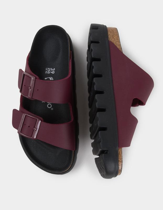 Birkenstock Arizona Chunky Sandals. A chunky platform sole takes the Arizona sandal's classic design to new heights—and your style along with it. With a statement tread that stands out from the rest and contoured footbed support on another level. Always ready to get up to something. Contoured cork-latex footbed. Synthetic Birko-Flor® upper. Suede footbed lining helps keep you comfortable. Flexible EVA sole. 1.25in chunky platform sole. Two adjustable straps with metal pin buckles. Imported.