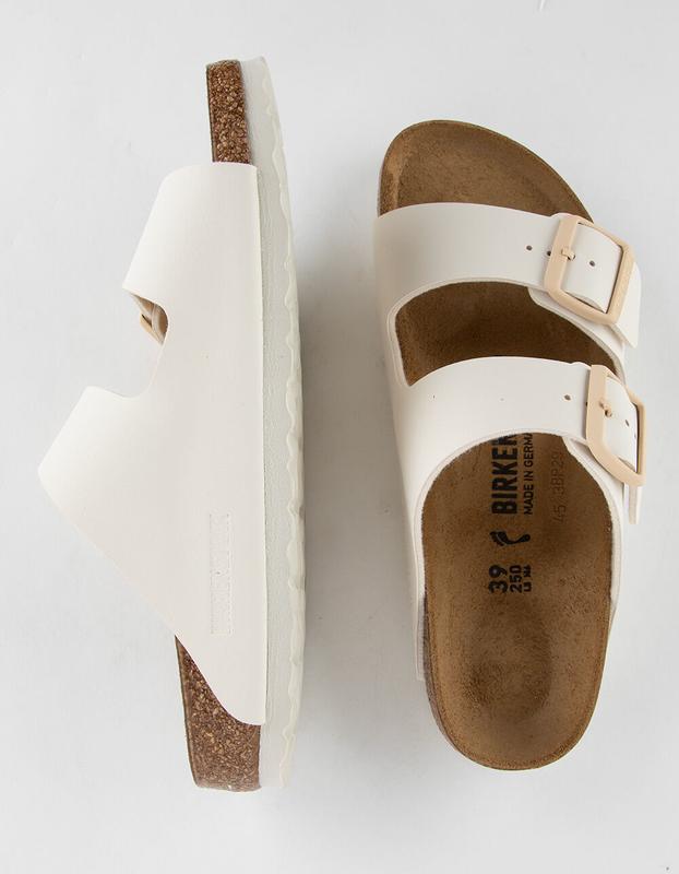 Birkenstock Arizona Sandals. This simple sandal with two straps stands for timeless design and has long held cult status thanks to its comfort factor. This version comes with a cool, colorful marble effect on the sole. The pattern is subtle but nonetheless a novel eye-catcher on this simple shoe. The upper is made from the skin-friendly, hard-wearing synthetic material Birko-Flor®. Anatomically shaped cork-latex footbed. Suede footbed lining. EVA sole. Imported.