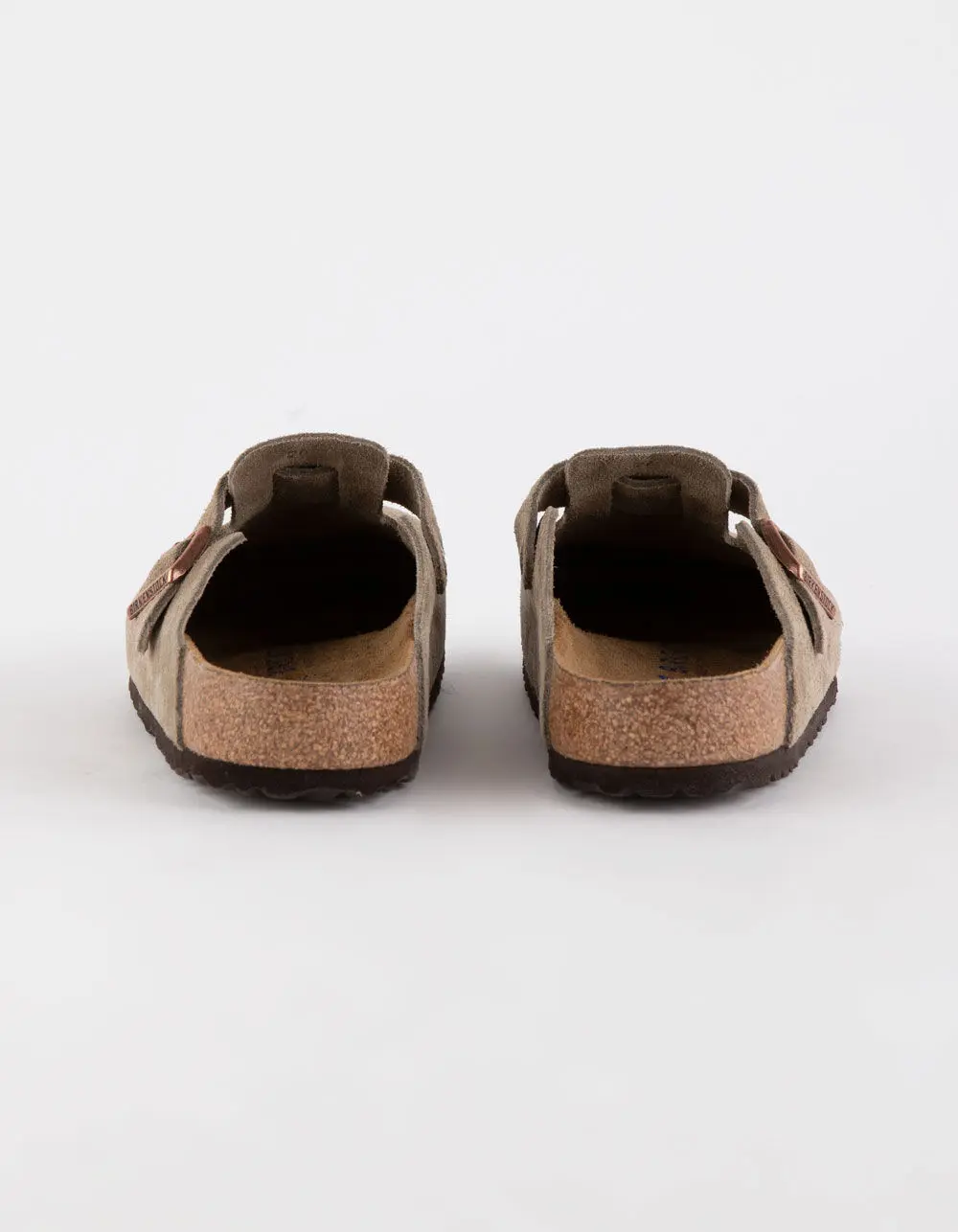 Birkenstock Boston Soft Footbed Clogs. Our most sought-after clog, the Boston lends a fashion-forward edge to any style. Velvety suede gives the laid-back look classic, every season appeal. Featuring an additional foam layer for cushioning, the soft footbed offers extra comfort plus go-all-day support. Cushioned Birkenstock soft footbed creates custom support with wear. Classic suede upper. Suede footbed lining helps keep you comfortable. EVA sole is flexible and lightweight. Adjustable strap with metal pin buckle. Imported.