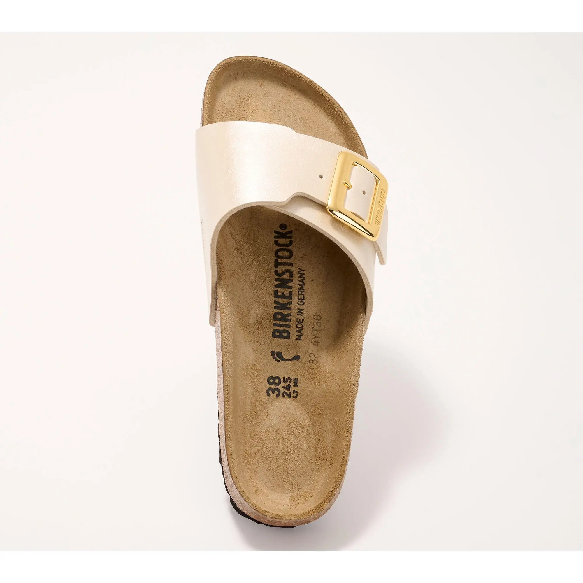Birkenstock Catalina Birkenstock contoured cork footbed supports the arches of the foot foot and conforms to the foot, with wear, to create a custom fit. The suede footbed lining helps keep you comfortable. Heel Height: Nuetral. Sole thinkness: 1/3 in COO: Imported. Fit True to Size. Synthetic Upper, Leather Lining, PU/EVA Outsole for traction Footbed is not removable