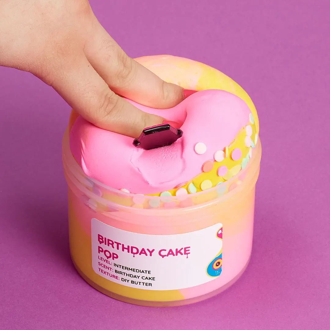 Birthday Cake Pop is a happy, celebratory DIY clay popsicle (complete with stick) and a fluffy slay slime base, scented exactly like our favorite birthday cake, decorated with happy sprinkles of course