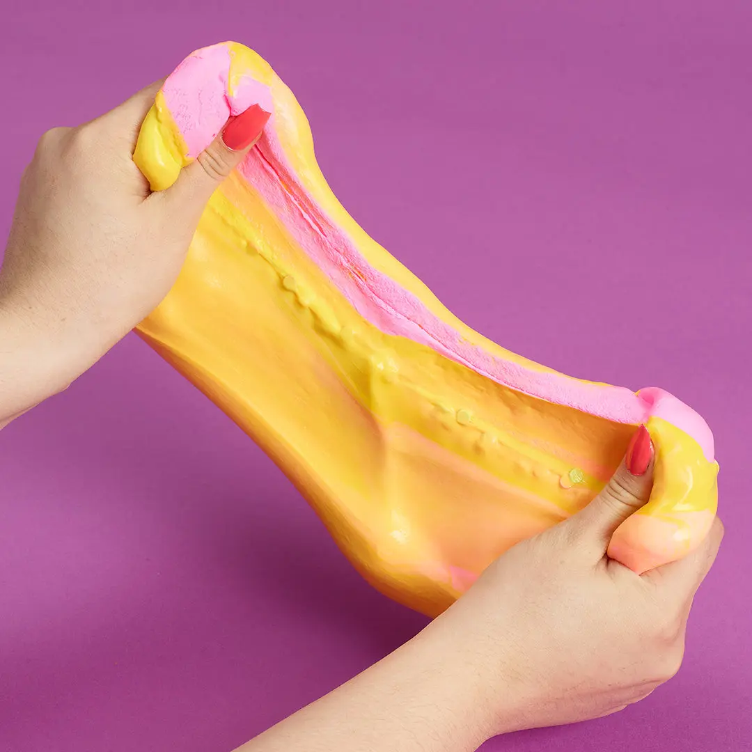 Smells like cake, but there was no pink in my slime again for the second slime in a row. My base slime was just orange. The clay piece was soft but didn’t help with the base slime much. The base was under activated. I usually don’t mind sticky slime because moving your hands quickly solves the issue. The problem with this base was that no matter how fast I moved my hands I couldn’t get the slime off my hands without a paper towel. Lucky I had some activator, but it’s pretty disappointing to have...