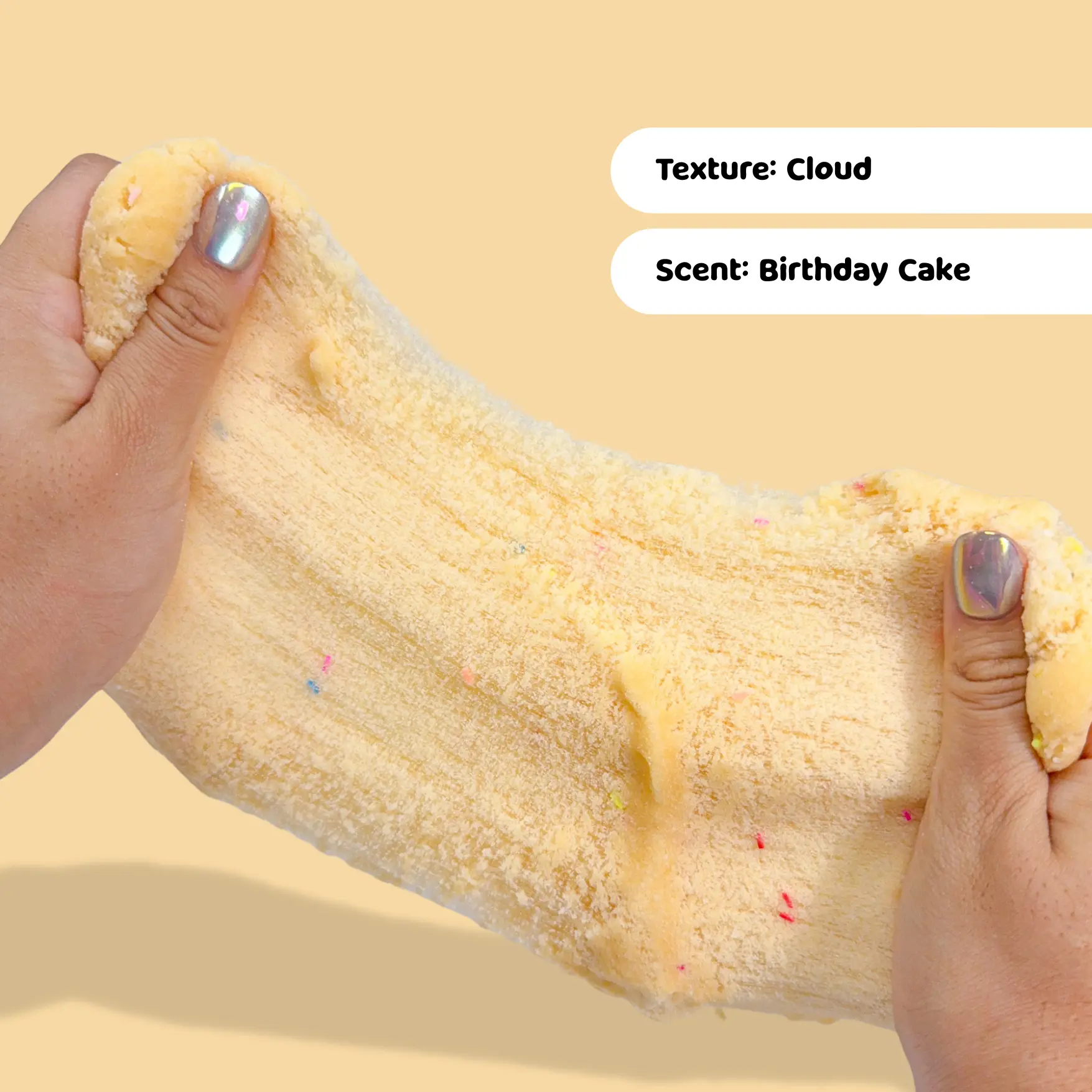 Texture: This slime features a dreamy cloud-like texture that comes with the cutest birthday cake themed charms and sprinkles. Stretch this slime to your desired fluffy consistency to make the most mesmerizing drizzles.
