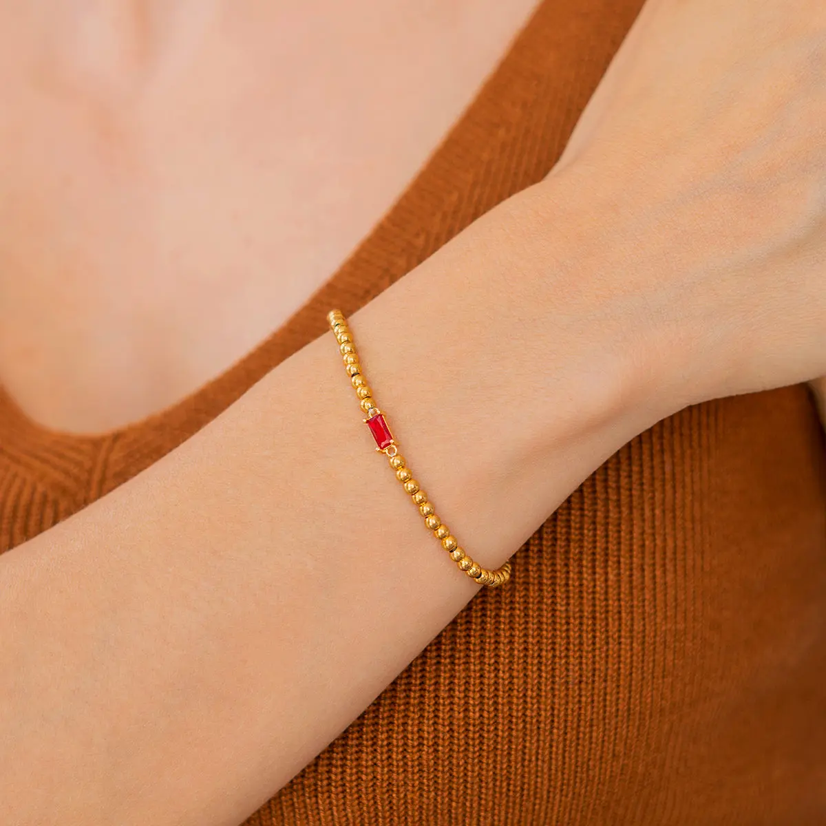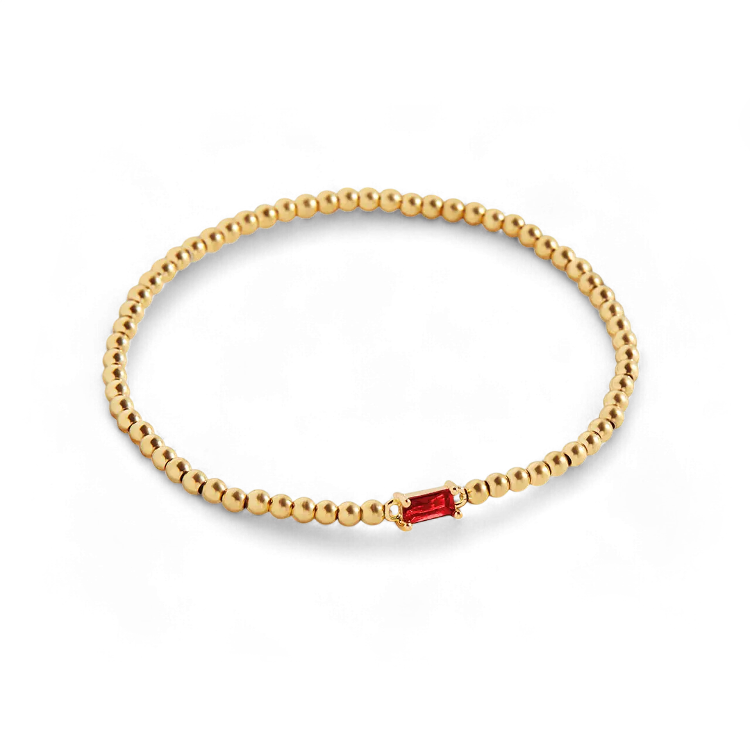 This chic bracelet features gold beads beautifully strung together, complemented by a sparkling birthstone representing your birth month. Ideal for stacking or wearing solo, this bracelet makes a thoughtful gift or a stylish way to celebrate your own special day.