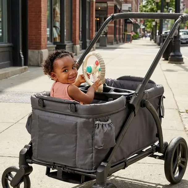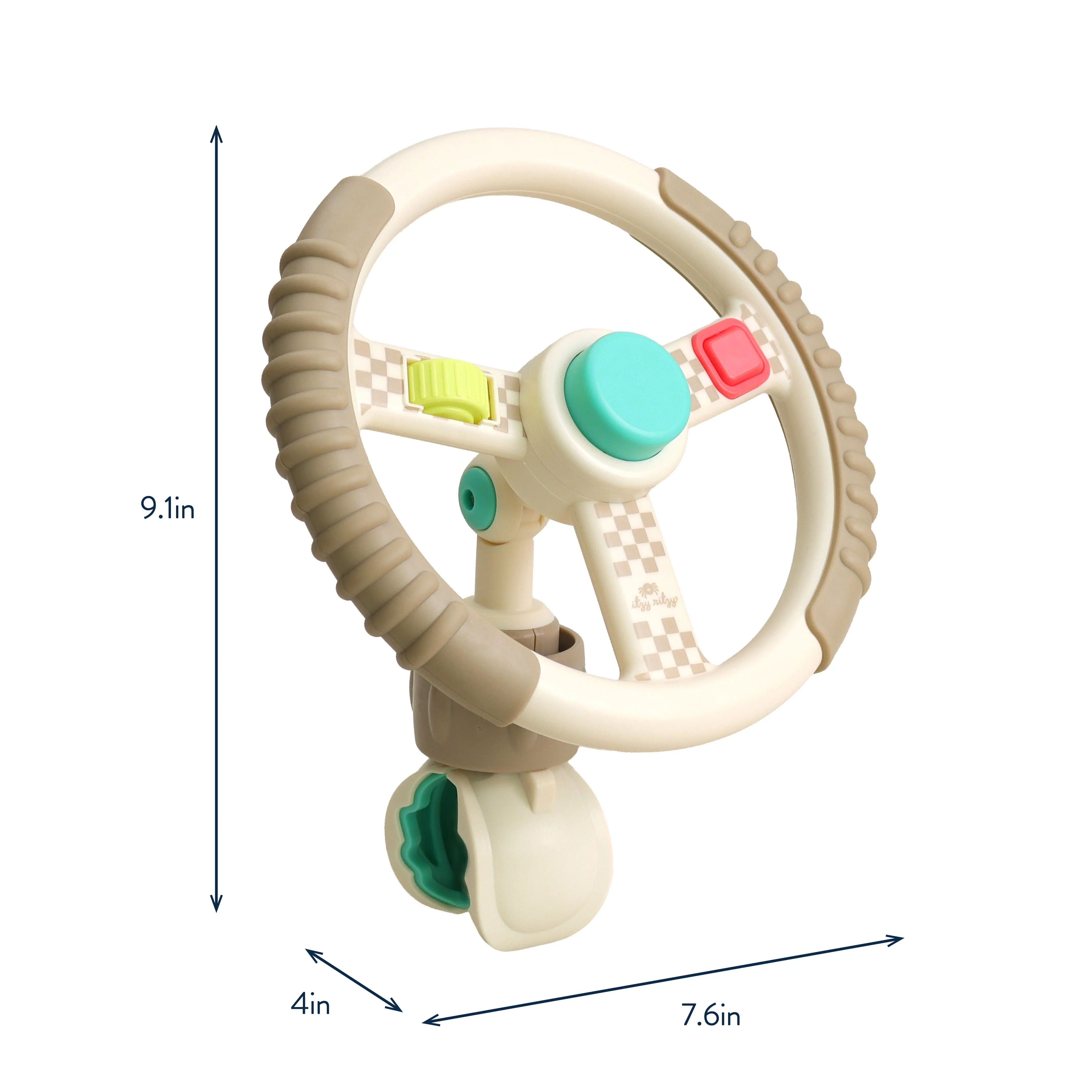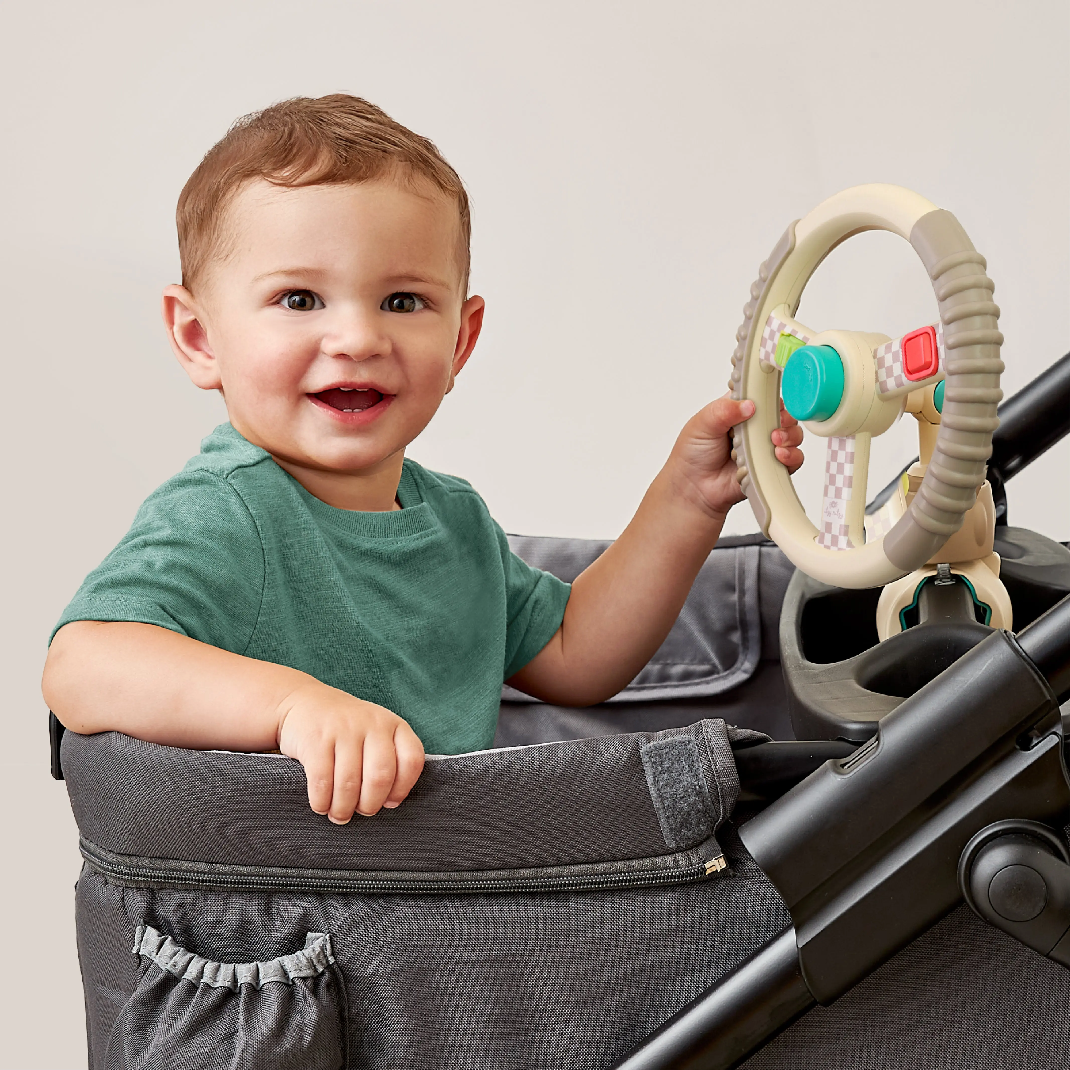The Bitzy Driver™ spinning steering wheel toy makes travel extra fun for the littles.Three integrated fidgets including rocker switch, rotating wheel, and joystick. Wheel pivots to three angles. Plus an adjustable clip fits on most strollers, wagons, and shopping carts.