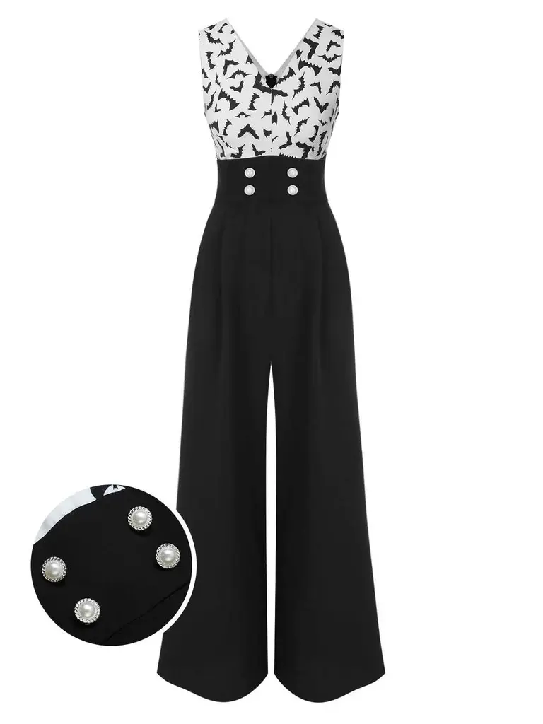 Chic with a spooky twist! This sleek jumpsuit flaunts a playful bat print on the bodice, ideal for embracing Halloween vibes with a sophisticated edge. The high-waisted, wide-leg design and button details add flair, making it a perfect pick for festive fun while staying effortlessly stylish!