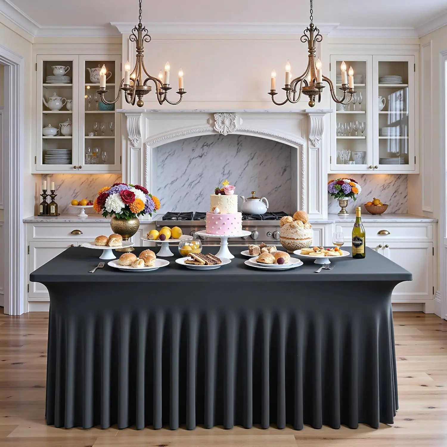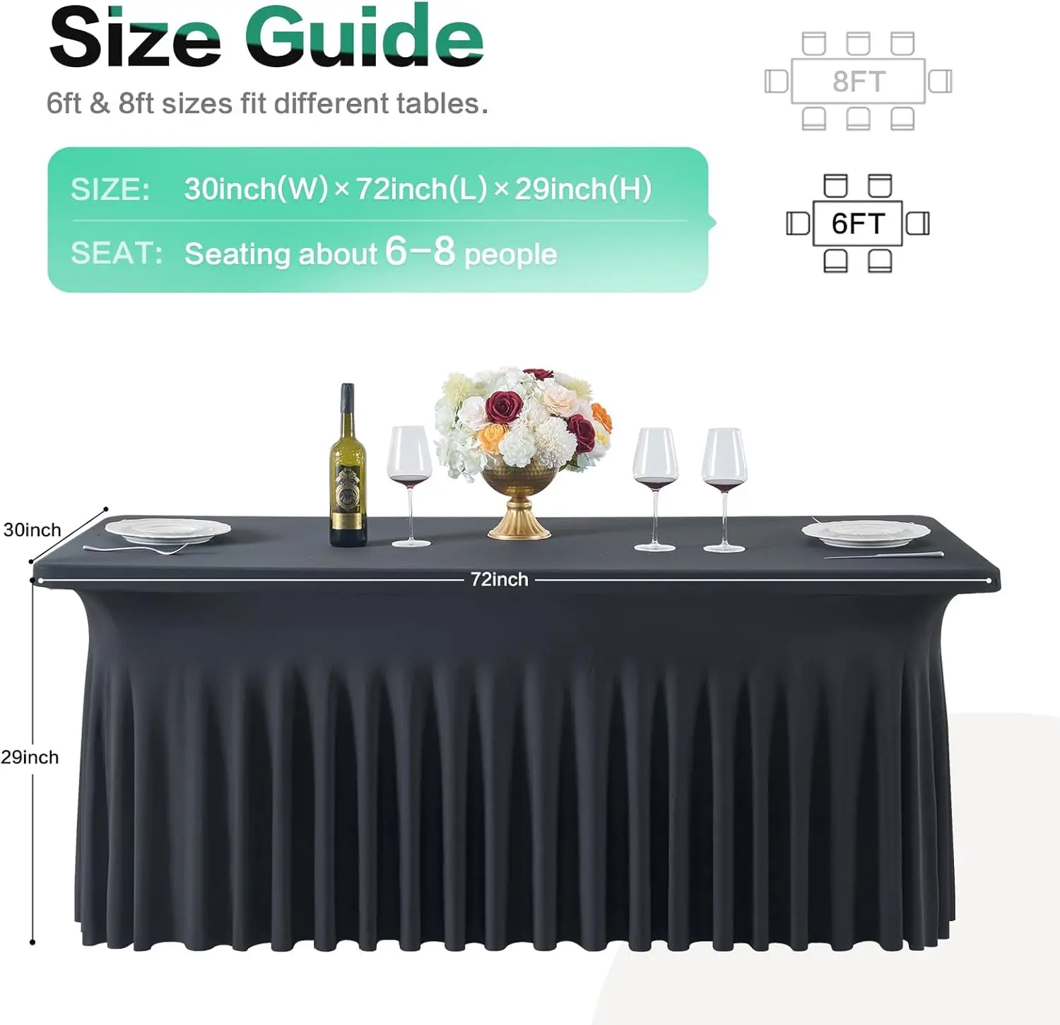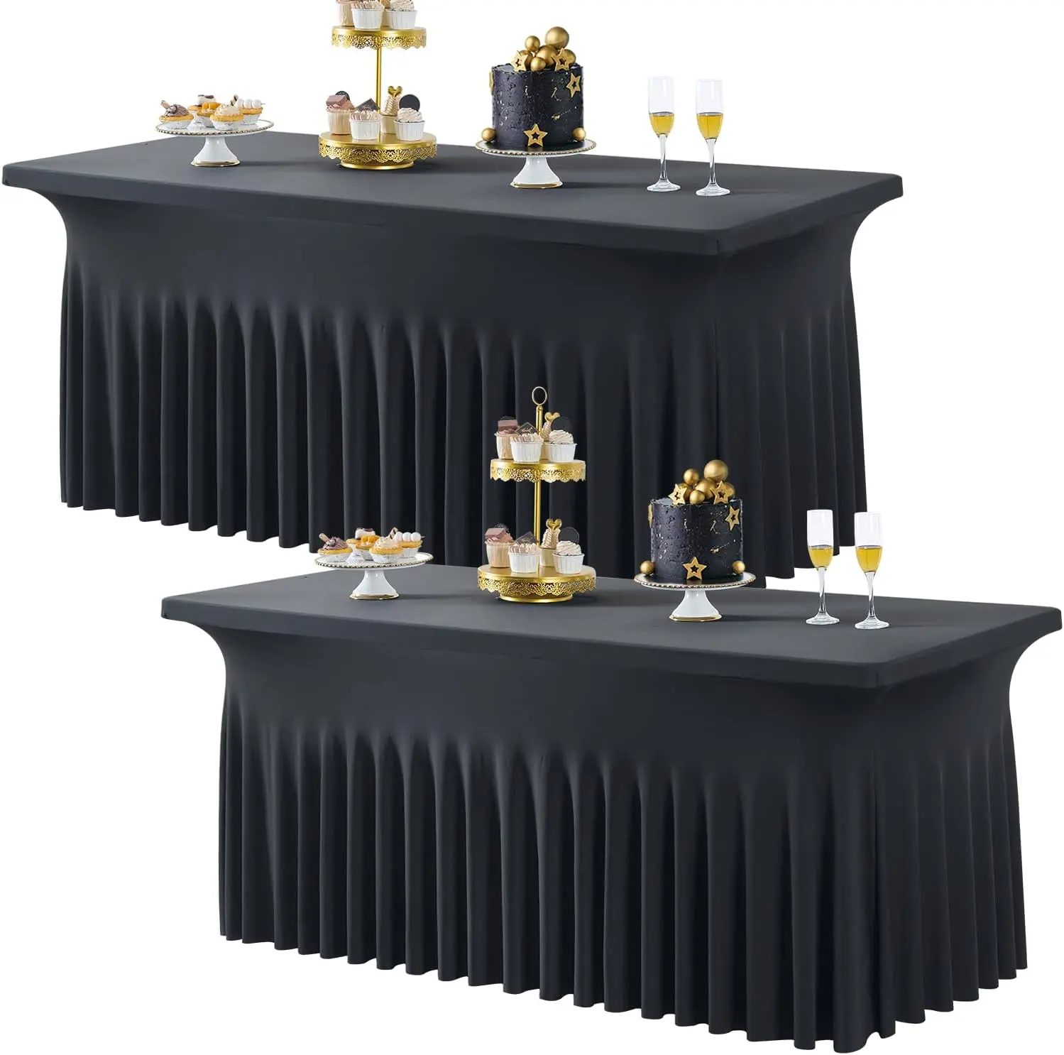 Elegant Wavy Look: You will get 2 count rectangule spandex tablecloth Fitted 6ft table. You don't need to spend any more time buying tablecloths and table skirt separately. Thanks to stretchy, wrinkle-resistant spandex, each gorgeous billow keeps its shape.
