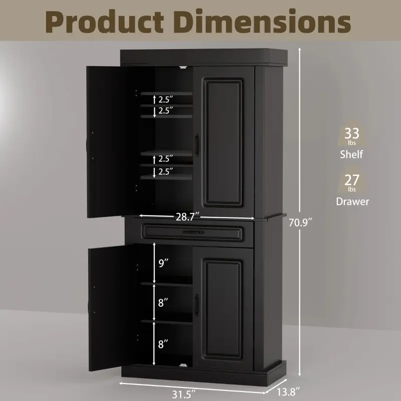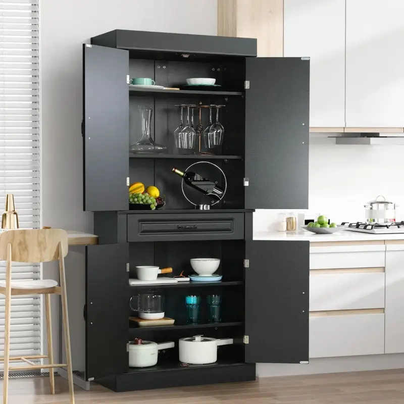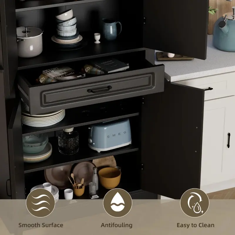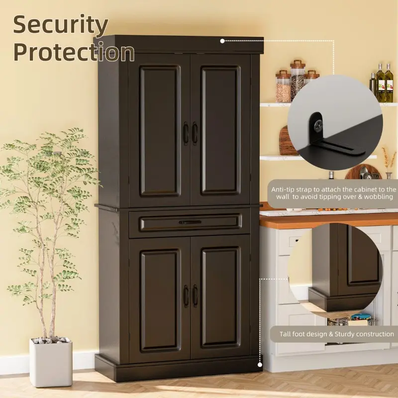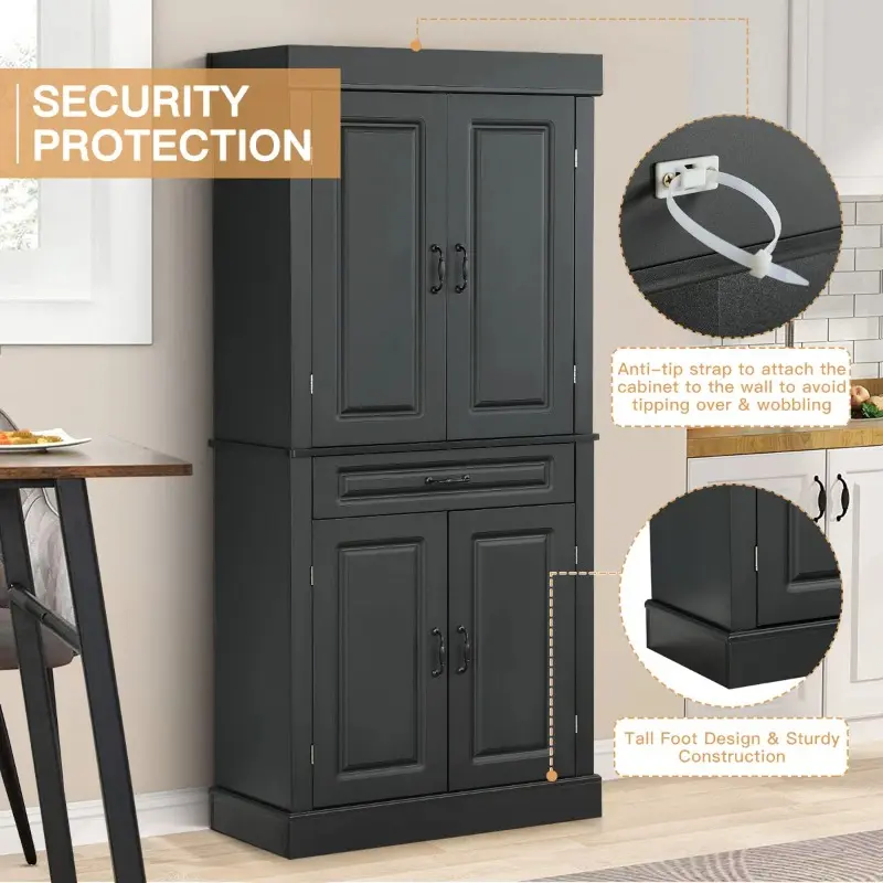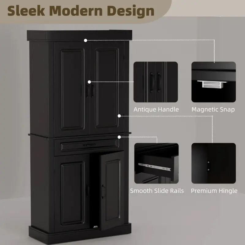 Clean lines and antique handles will bring elegance and glamour to your home decor. Classic and functional, it can be the functional heart of your home space, no matter where it is in any kitchen, dining room, bedroom, bathroom, or hallway. Made from 0.6" thick premium MDF, this pantry is sturdy, stable, and durable enough to provide long-term storage for your items. The upgraded premium metal hinge offers high performance in terms of resistance and flexibility.