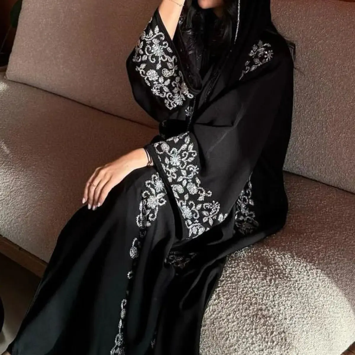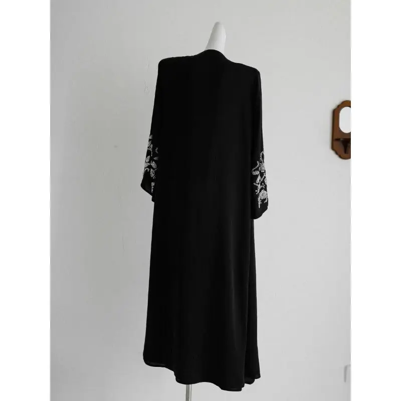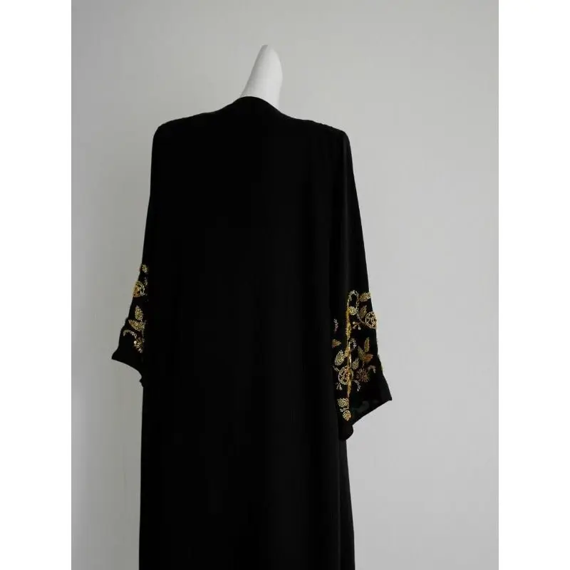 The abaya is crafted from premium weighted crepe, allowing for a fluid drape and graceful movement without static. Its metallic embroidery in silver and gold beads forms delicate floral motifs along the fabric, creating a look that is both refined and eye-catching.
